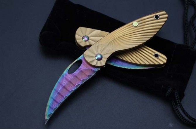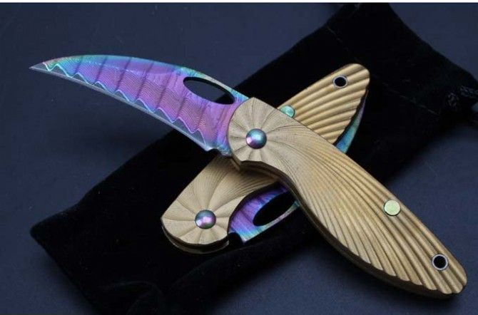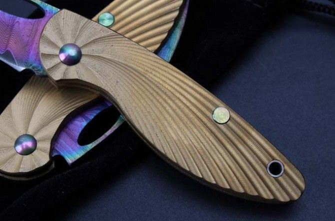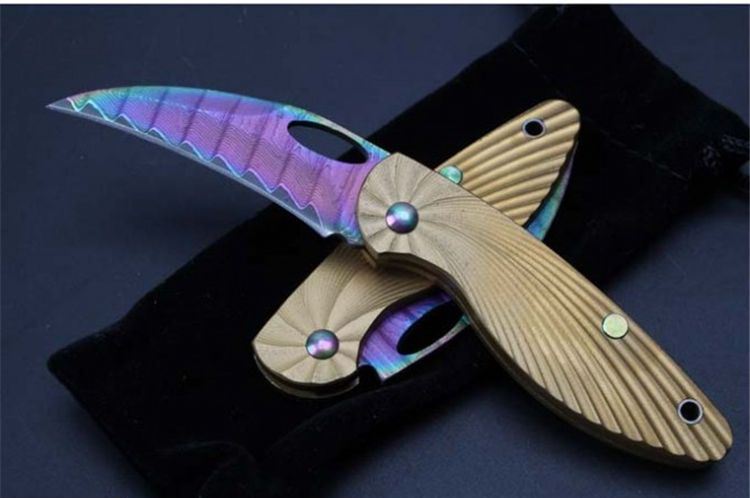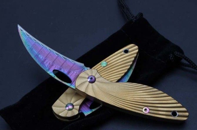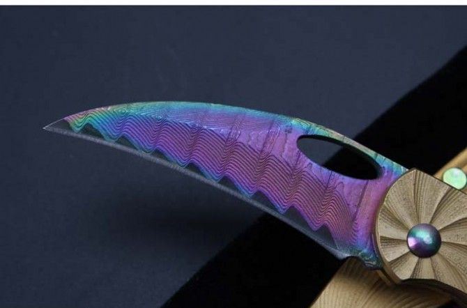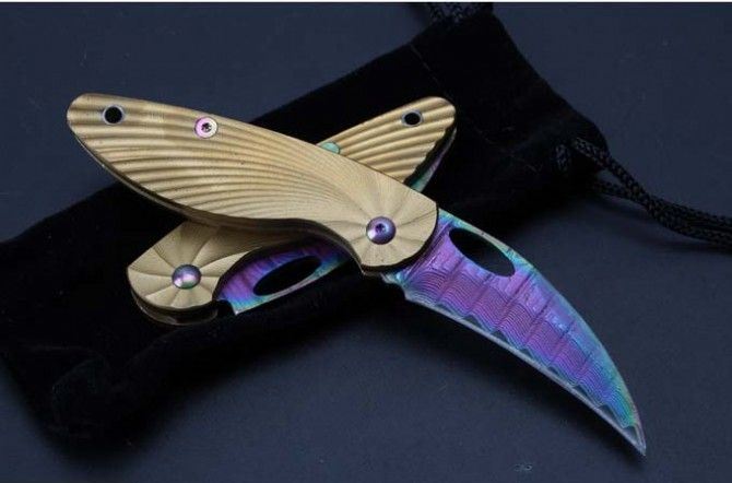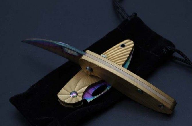 大马士革彩幻翠鸟弹力小折刀 全长:12cm 刃长:5cm 刃宽:1.7cm(最宽处) 柄长:7cm 刃厚:2.8mm 刃材:幻彩大马士革 柄材:合金 硬度:59HRC 表面:幻彩大马士革 重量:74克(含包装) 锁闭线锁 包装:纸盒 备注:带小绒布袋
