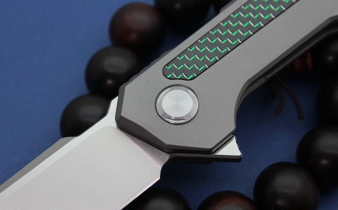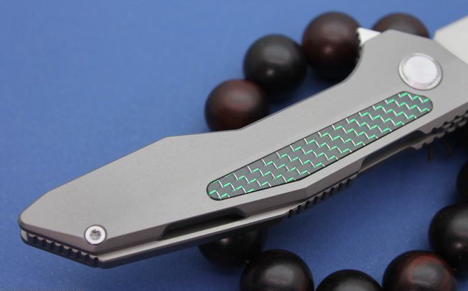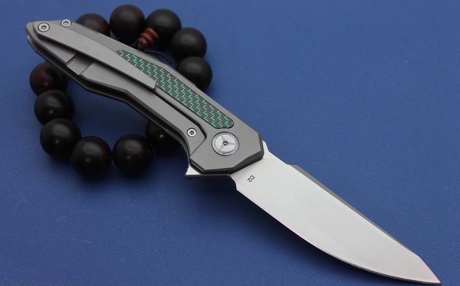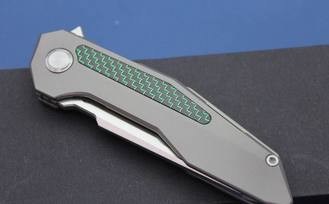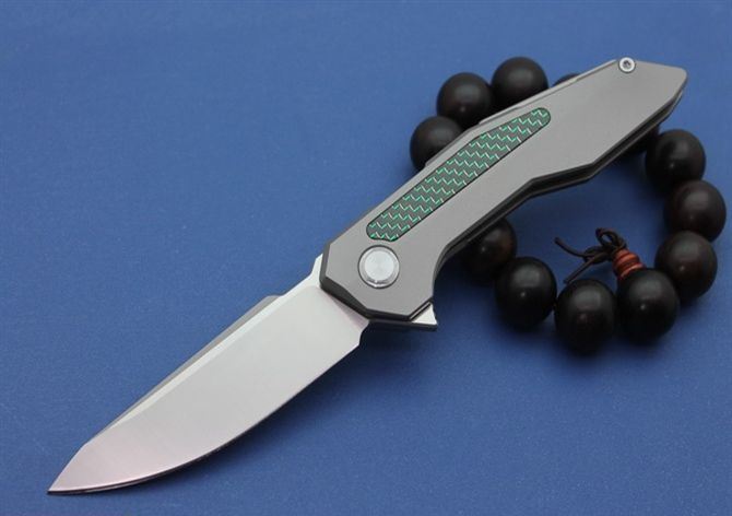 TS42牧马人折刀 全长:210mm 刃度:85mm 柄长:110mm 刀片厚度:4mm 刀片宽度:25.5mm 刀片材质:D2(房间100%,D2,可以测试) 处理材料:砂光拉丝 柄材:钛合金+碳纤 手柄处理:CNC 硬度:58-60HRC 系统:滚珠轴承系统 净重:130克