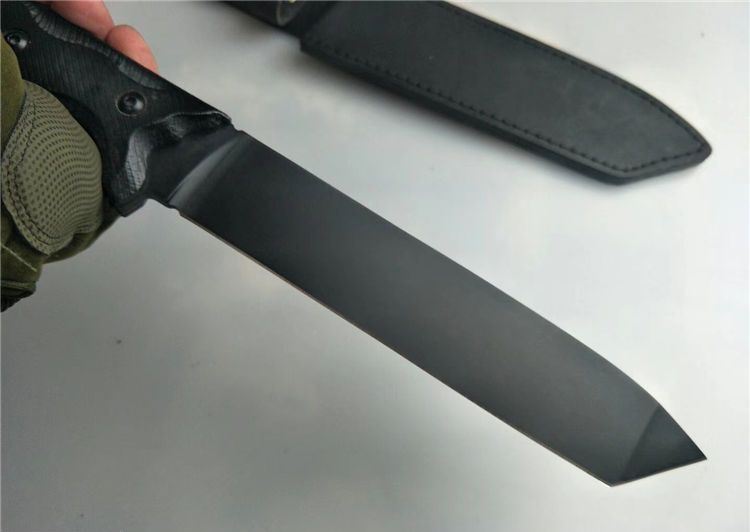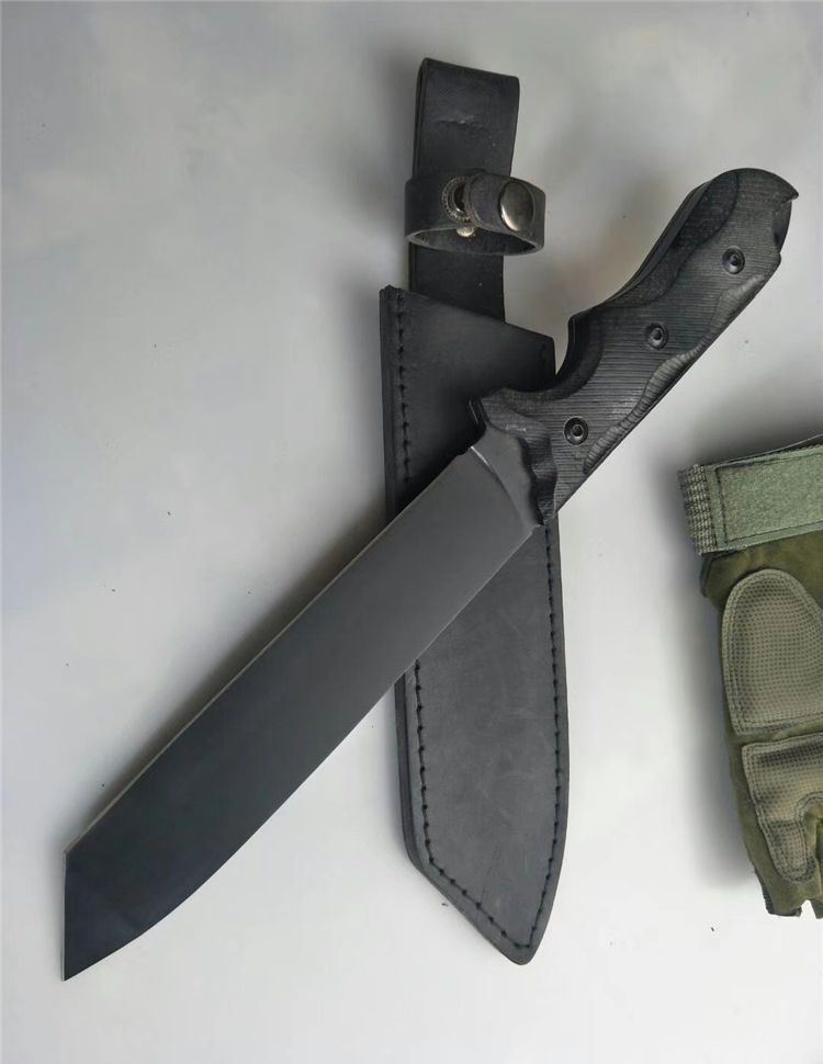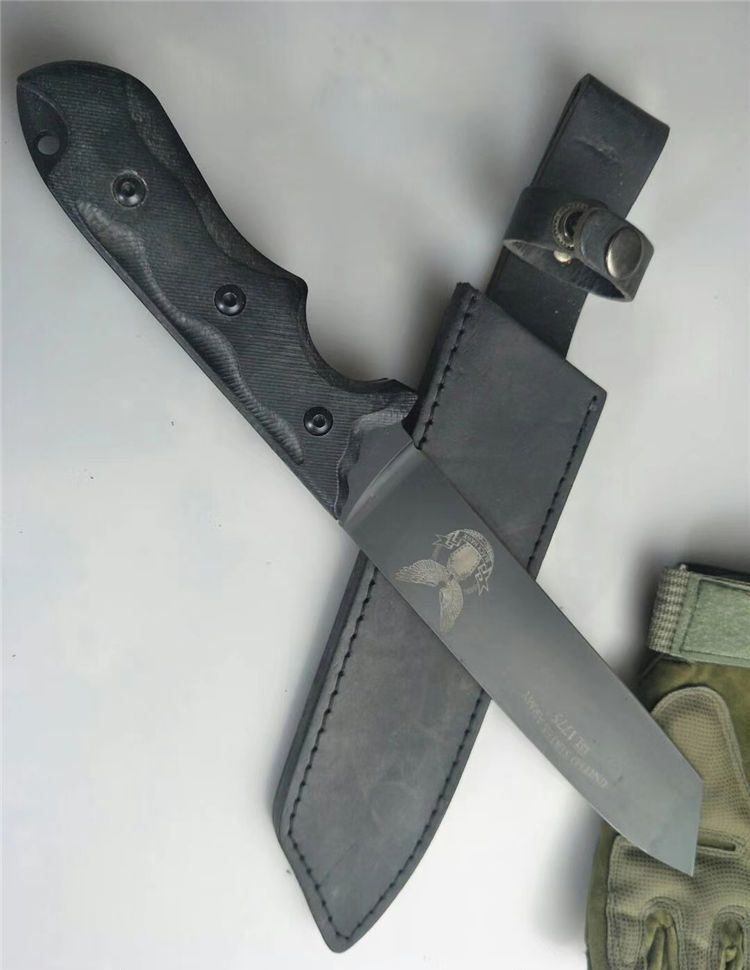 雄鹰战术直刀 全长:34cm 刃长:20cm 柄长:14.5cm 刃宽:3.5cm 刃厚:8mm 刃材:9Cr13Mov 硬度:56HRC 表面:镀钛 柄材:黑檀 其他:皮套