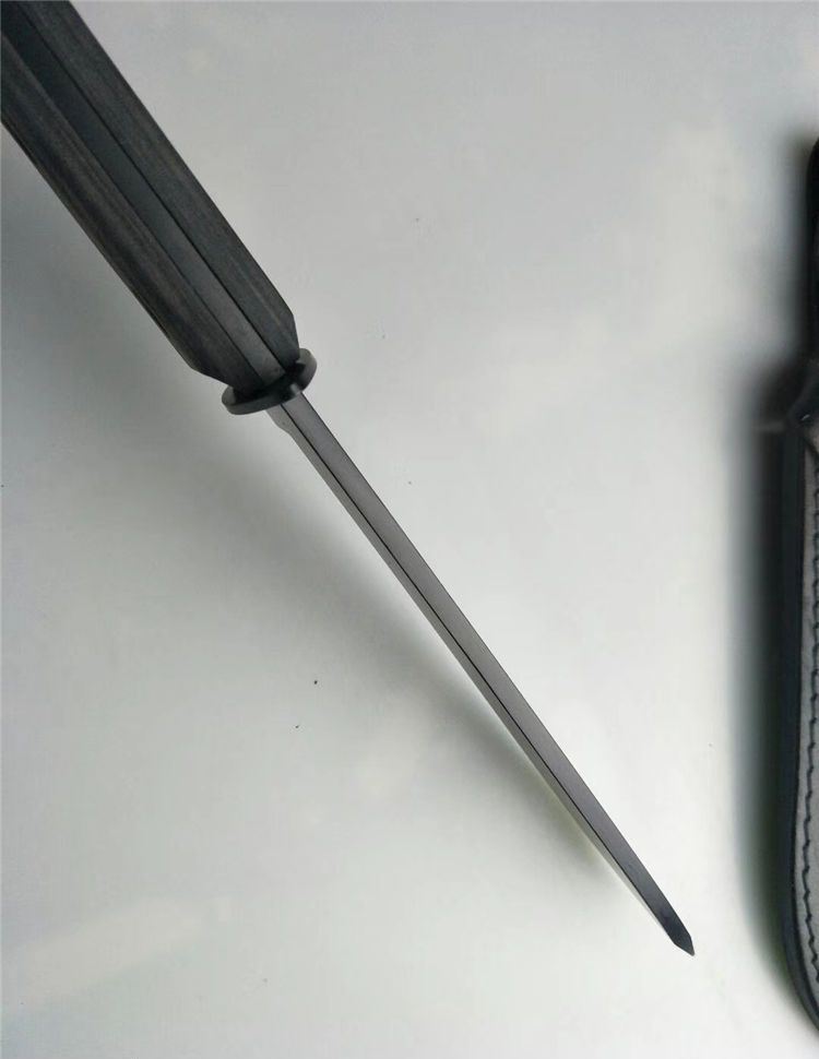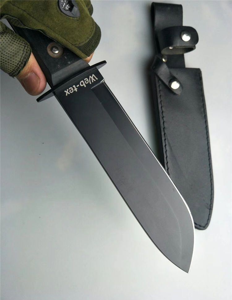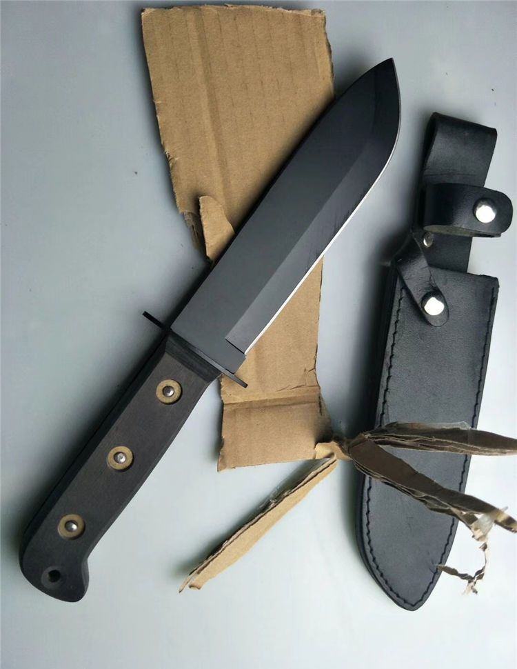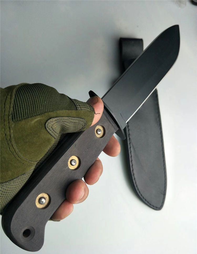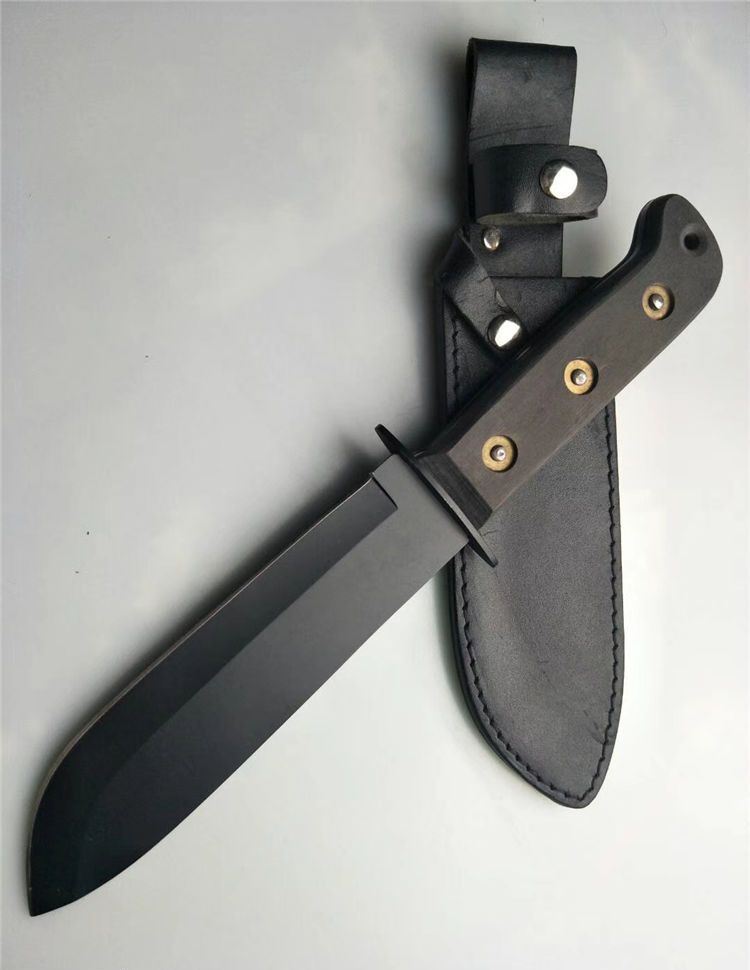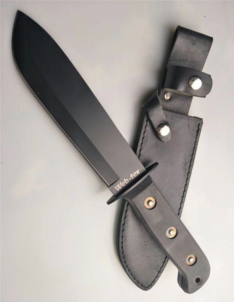 征服者砍刀 刃长:17.5cm 柄长:13cm 刃宽:4.2cm 刃厚:4.7mm 刃材:5Cr13Mov 硬度:56HRC 表面:镀钛 柄材:黑檀 其他:真皮套