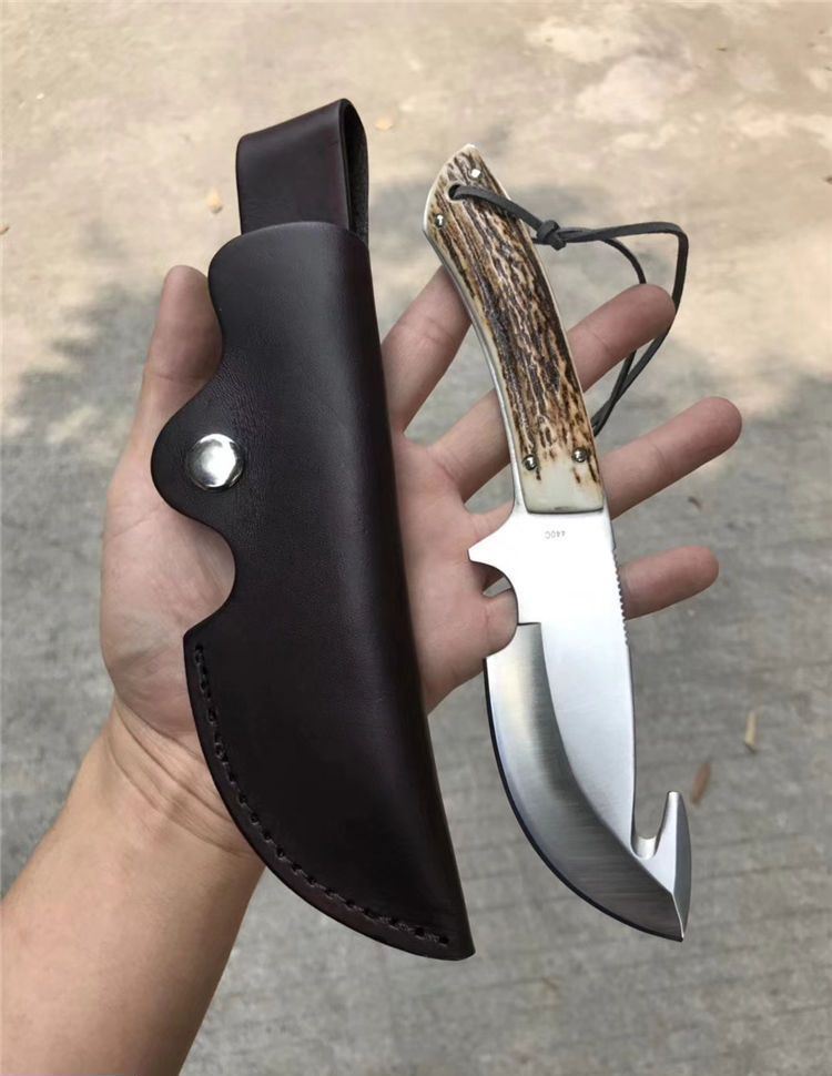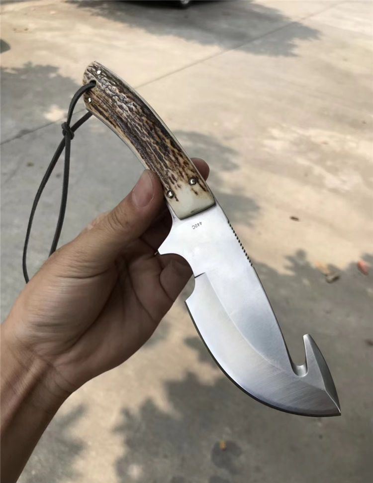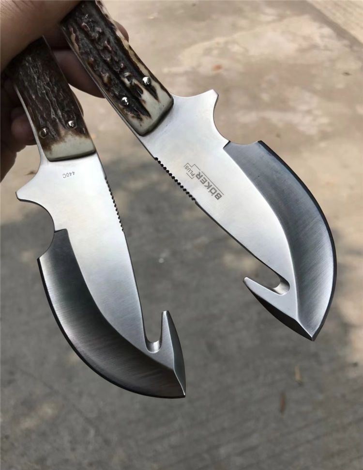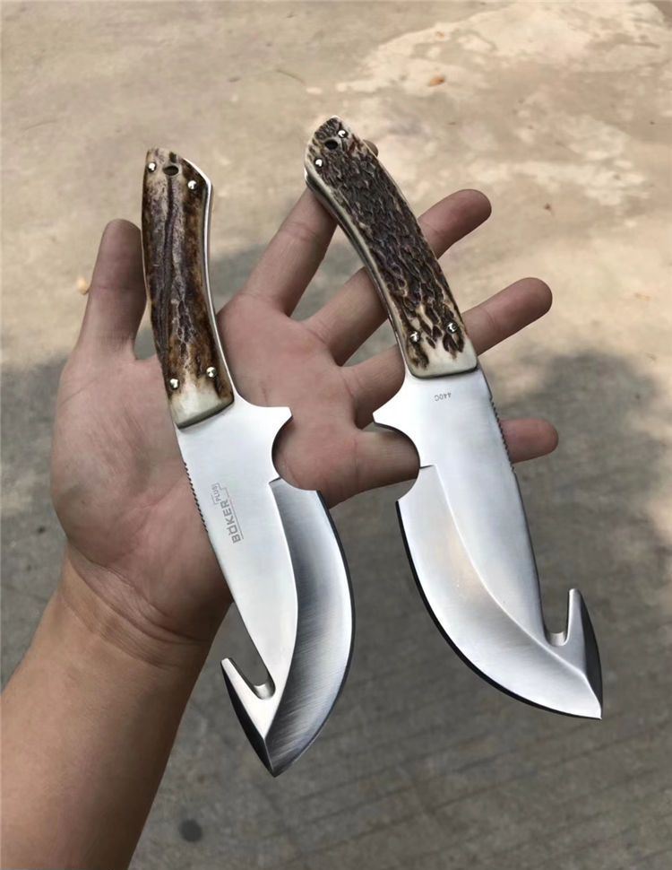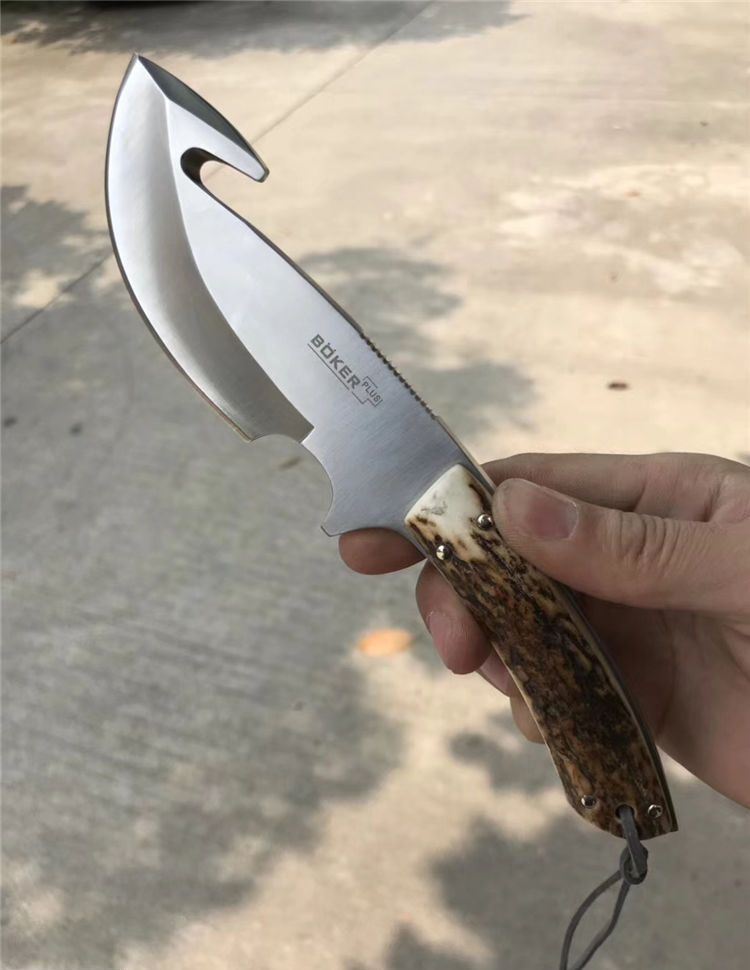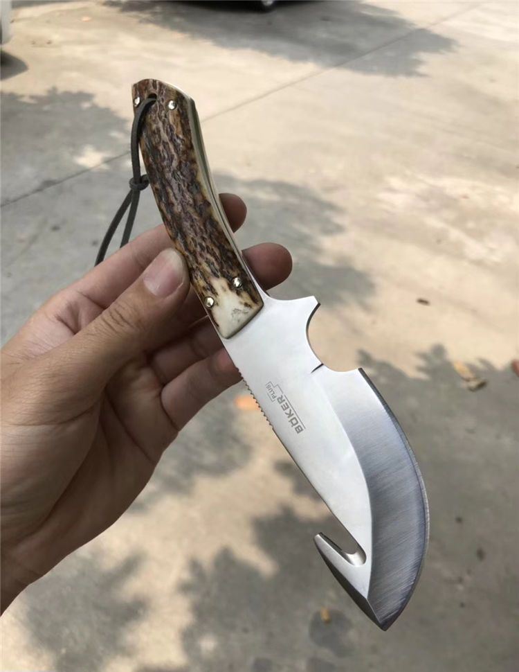 博克战斧鹿角猎刀 硬度:59-60HRC 总长:22出门 刃长:8cm 刃厚:4mm 刃宽:4.5cm 柄材:天然野生老鹿角柄 皮套:阿根廷进口植鞣皮,香港公司制作 钢材:进口440C钢,真空热处理 包装:黑色礼盒 包装盒子稍微有一点旧,毕竟是三年前的货
