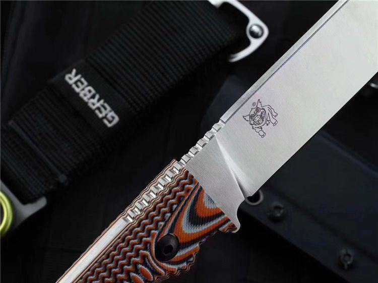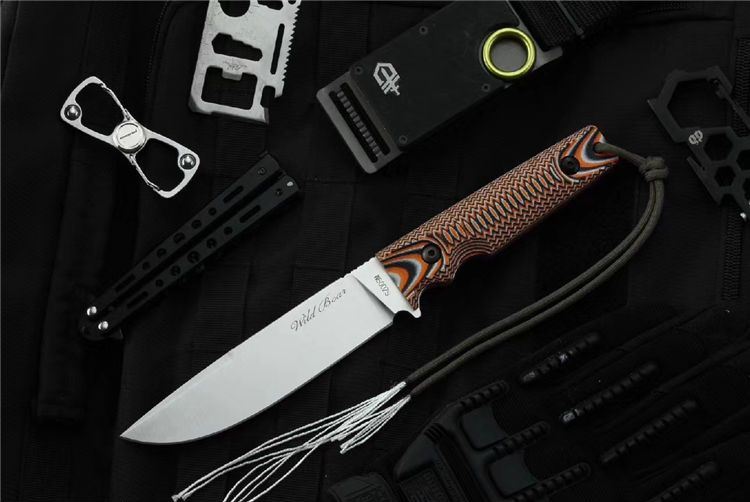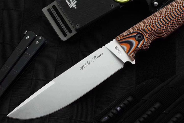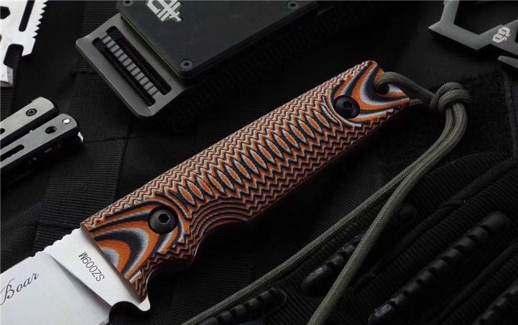 山猪突进者直刀 全长:27.5cm 刃长:15cm 刃宽:3.4cm 刃材:进口D2 硬度:60HRC 表面:沙光 刃厚:0.4cm 柄长:12.5cm 柄材:G10经CNC加工 重量:320g (含鞘)
