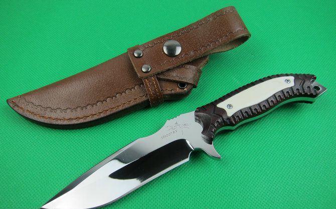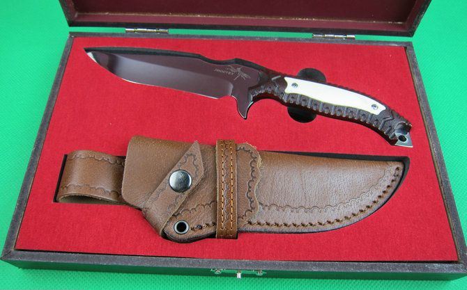 螳螂VG10超镜光限量版收藏刀 全 长:23.2cm 刃 长:10.6cm 柄 长:11cm 刃 宽:3.0cm(最宽处) 刃 厚:4.9mm 刃 材:真正进口VG10钢材 硬 度:61HRC 刀 柄:红檀柄+兽骨 表 面:超镜光 重 量:710克 备 注:原厂收藏木盒,优质进口真牛皮套