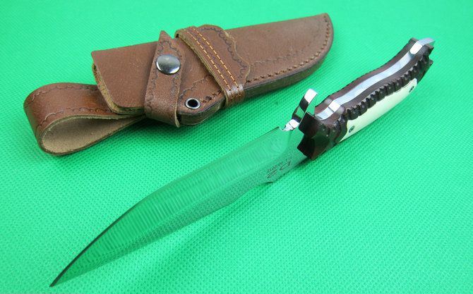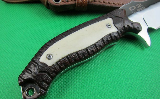 全 长:23.2cm 刃 长:10.6cm 柄 长:11cm 刃 宽:3.0cm(最宽处) 刃 厚:4.9mm 刃 材:真正进口VG10钢材 硬 度:61HRC 刀 柄:红檀柄+兽骨 表 面:超镜光 重 量:710克 备 注:原厂收藏木盒,优质进口真牛皮套