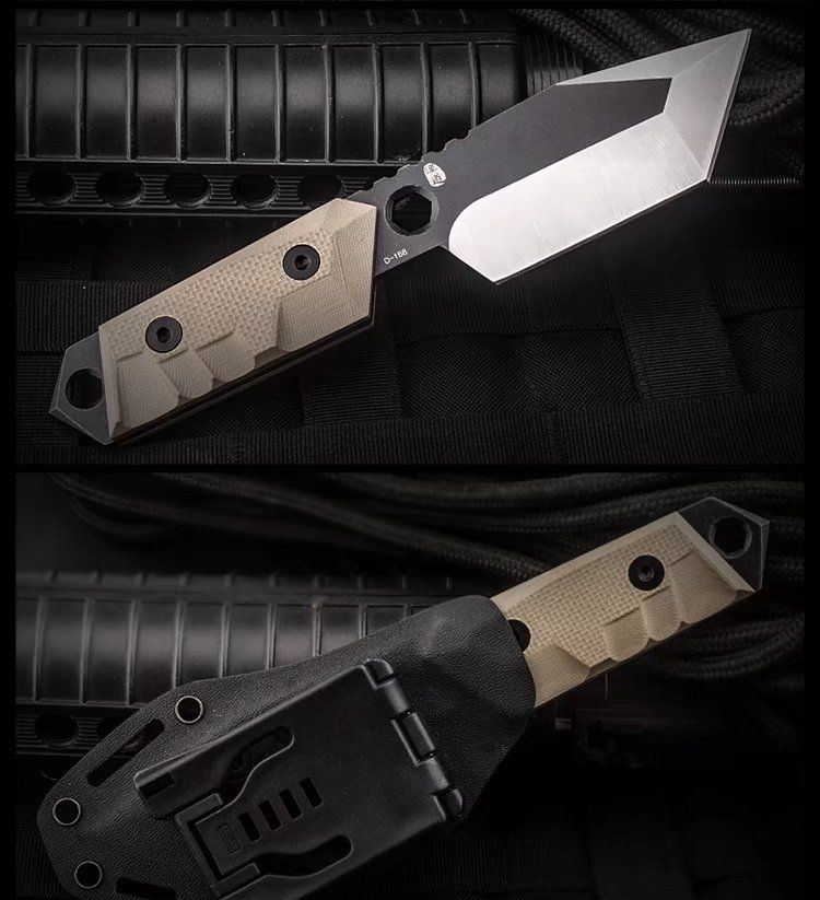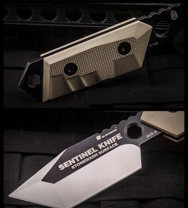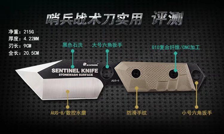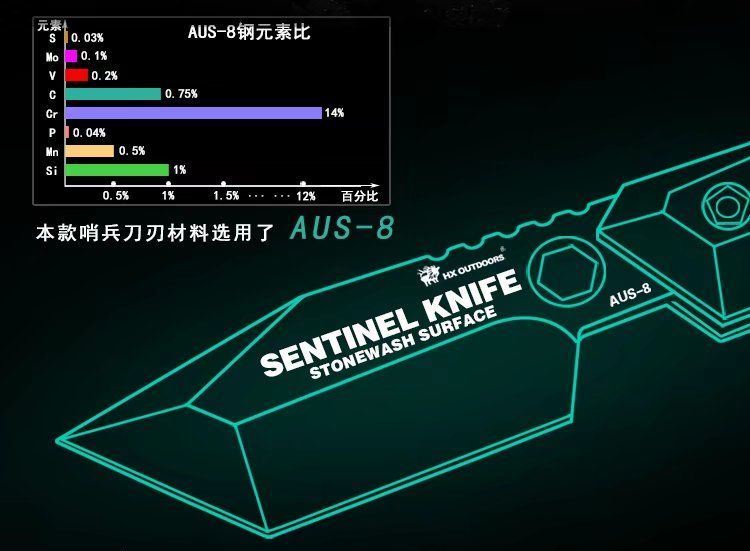 简单粗暴,机械激进,汉道哨兵战术刀外形设计简单直接,刀刃、刀背三角度开刃,应对更多角度的切割,刀尖两刃交汇,大大增强穿刺能力,AUS-8+数控水磨,磨刃角度精准,刃面光滑锋利,刀面黑钛石洗处理,耐锈耐磨,手