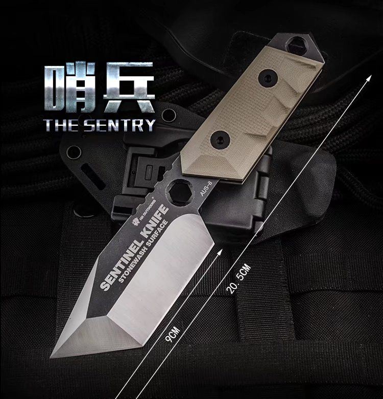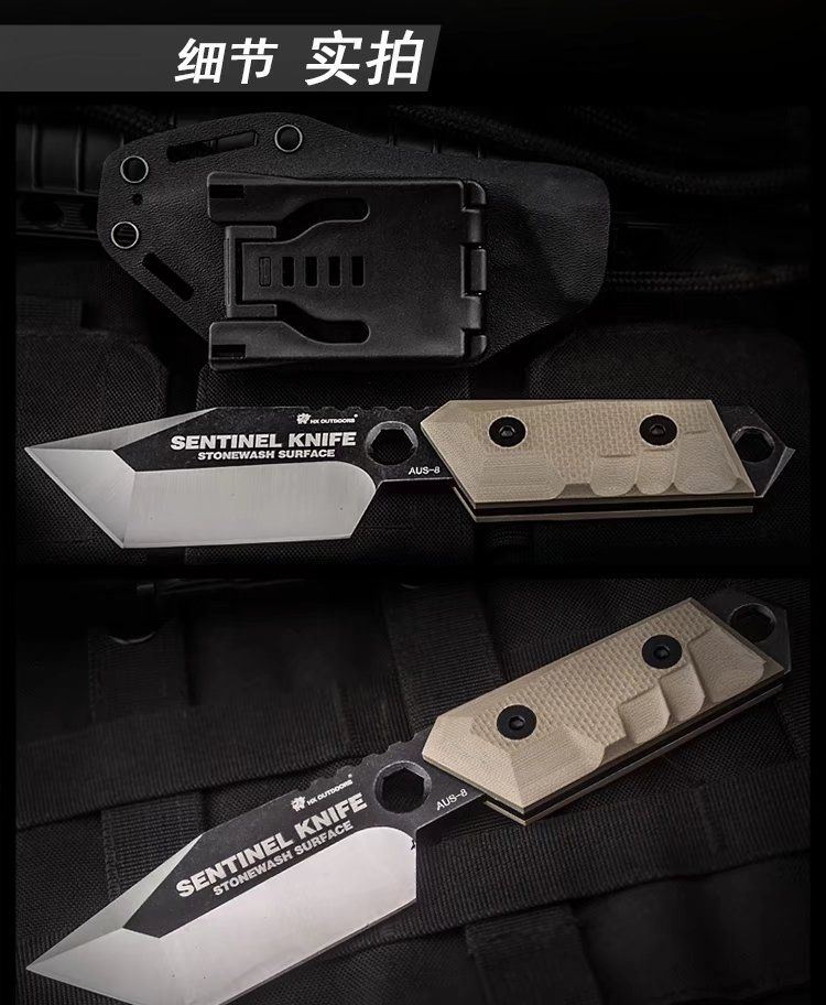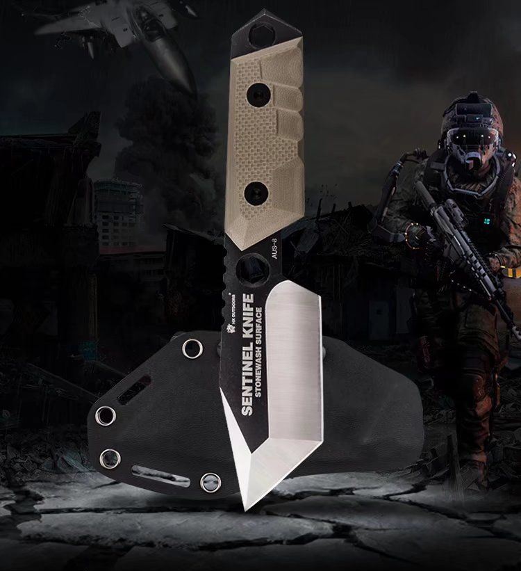 汉道哨兵战术直刀 简单粗暴,机械激进,汉道哨兵战术刀外形设计简单直接,刀刃、刀背三角度开刃,应对更多角度的切割,刀尖两刃交汇,大大增强穿刺能力,AUS-8+数控水磨,磨刃角度精准,刃面光滑锋利,刀面黑钛石洗处理,耐锈耐磨,手