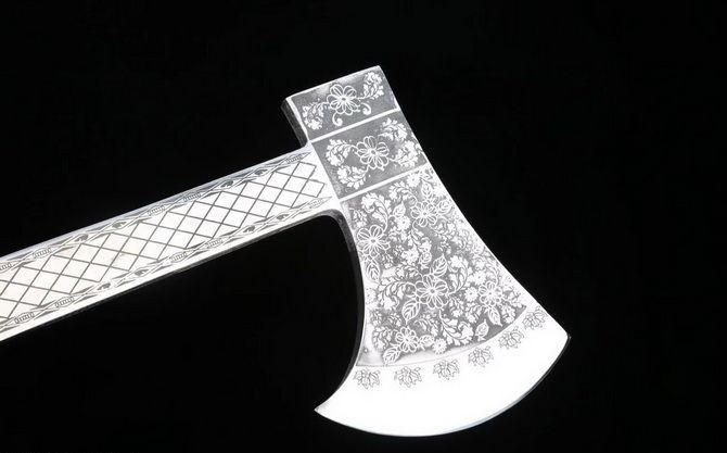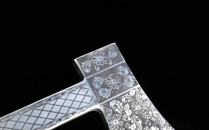 消防花斧破拆斧 高锰钢腐蚀雕花工艺 全长:36cm 宽:13cm 刃宽:10cm 柄长:30cm 厚:0.8cm 重:0.9kg
