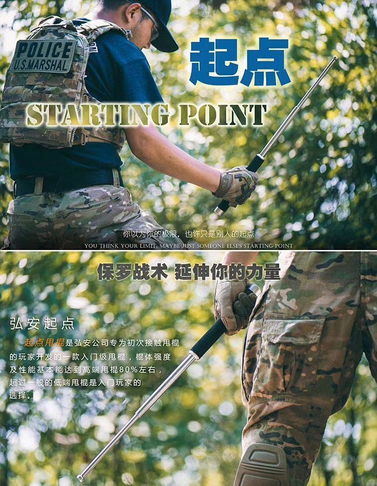 起点甩棍是弘安公司专为初次接触甩棍的玩家开发的一款入门级甩棍,棍体强度及性能基本能达到高端甩棍80%左右,远超一般的低端甩棍是入门玩家的最佳选择。是一款极具性价比的中端甩棍