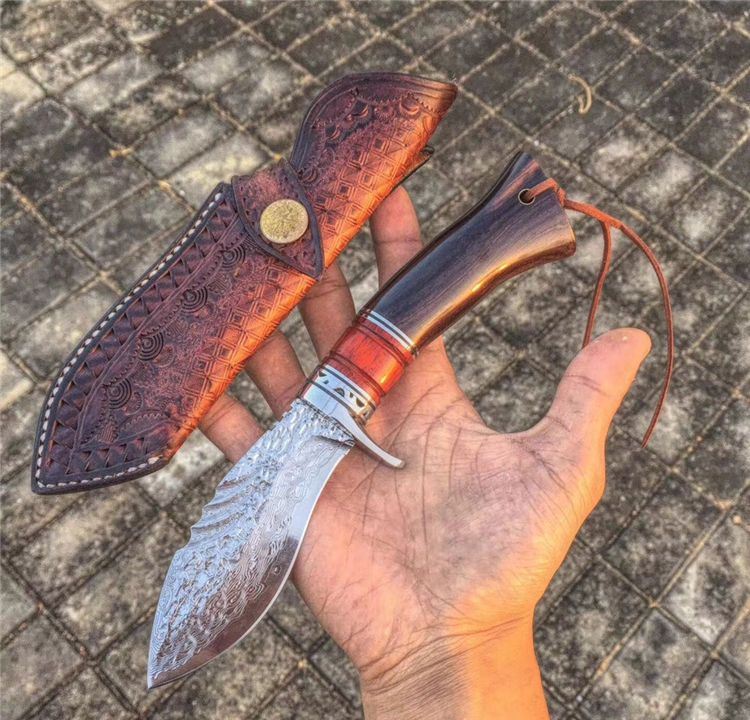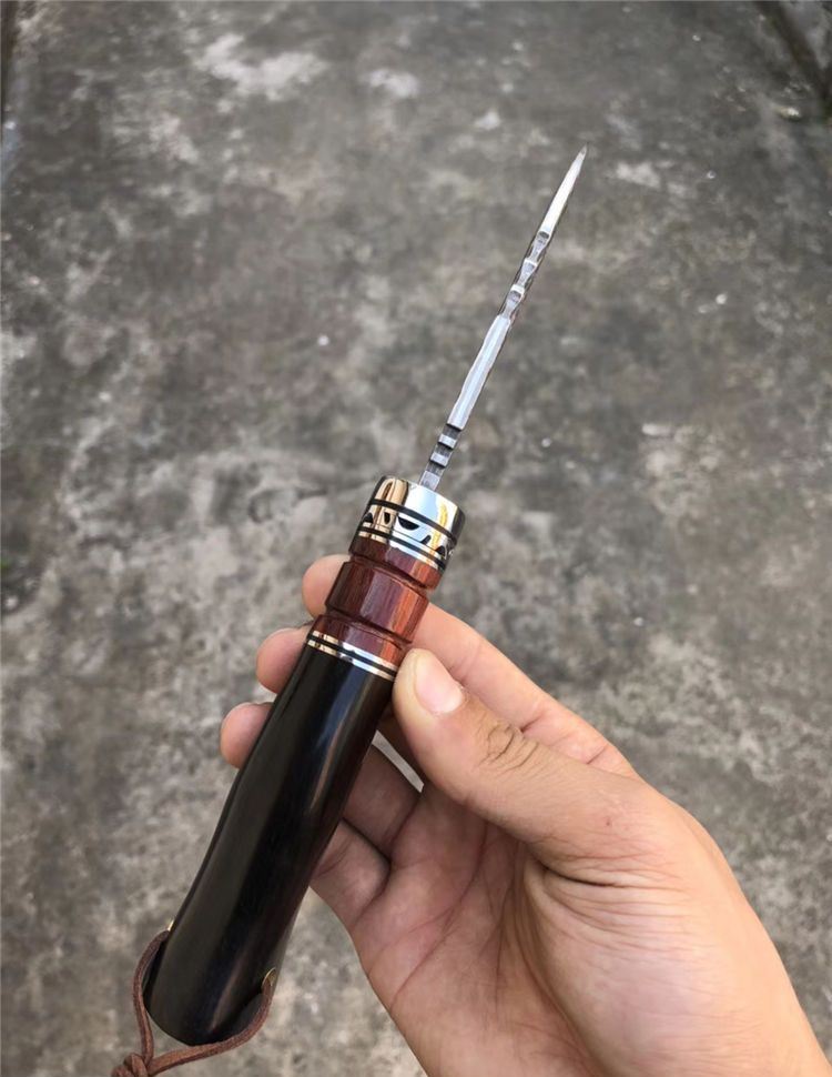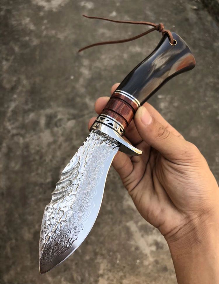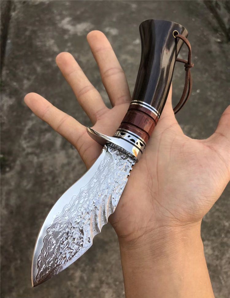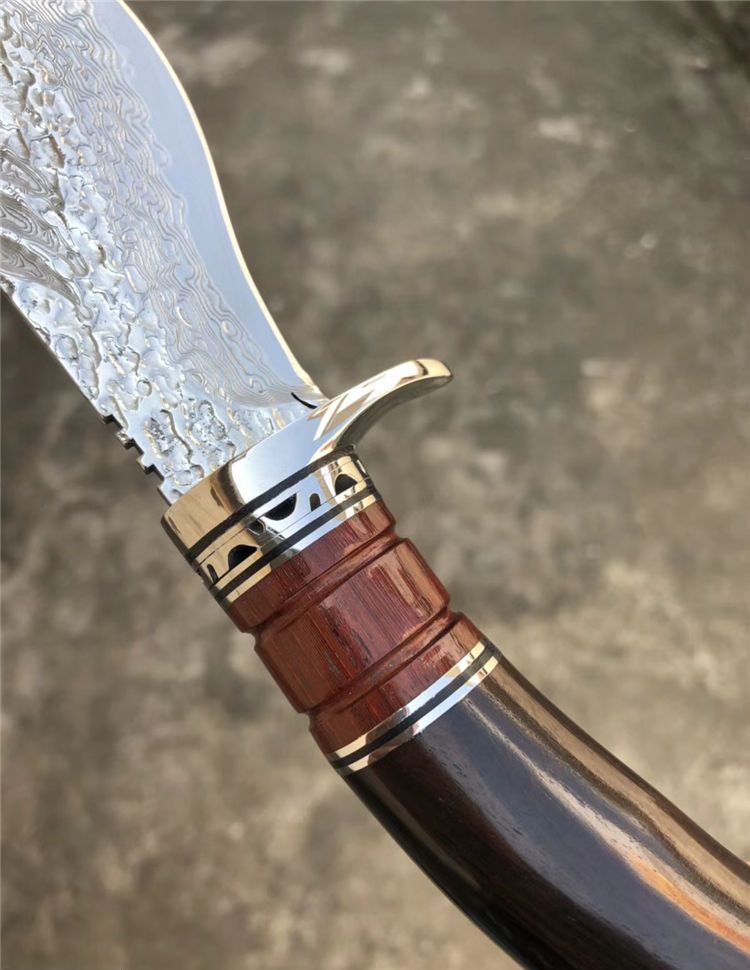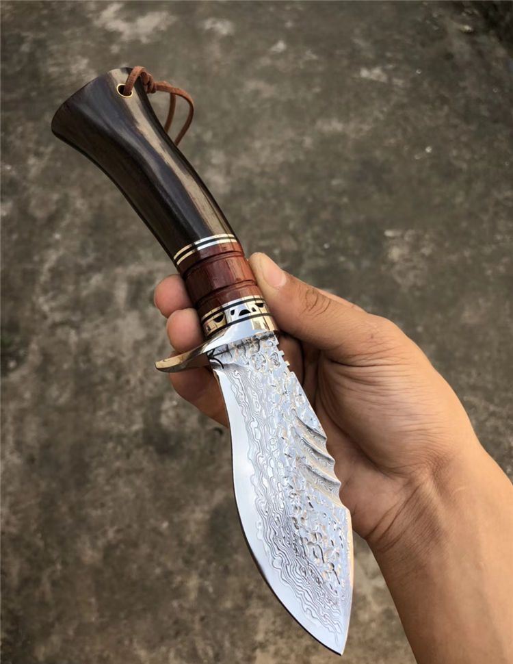 大马士革钢北海战鲨直刀 全长:23cm 刃长:10.5cm 柄长:12.5cm 刃材:大马士革钢VG10 硬度:60HRC(热处理) 刃厚:4MM 刃最宽处:4CM 柄材:钢头+血檀木+黑檀木 包装配置:手工雕花皮套刀套+礼盒装