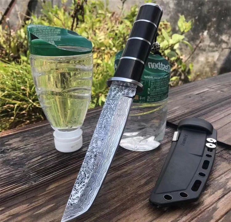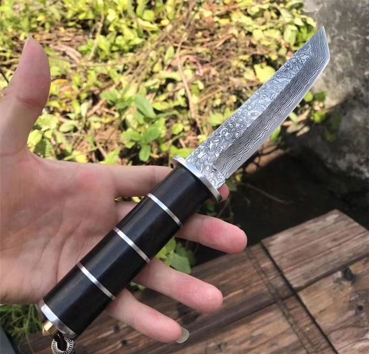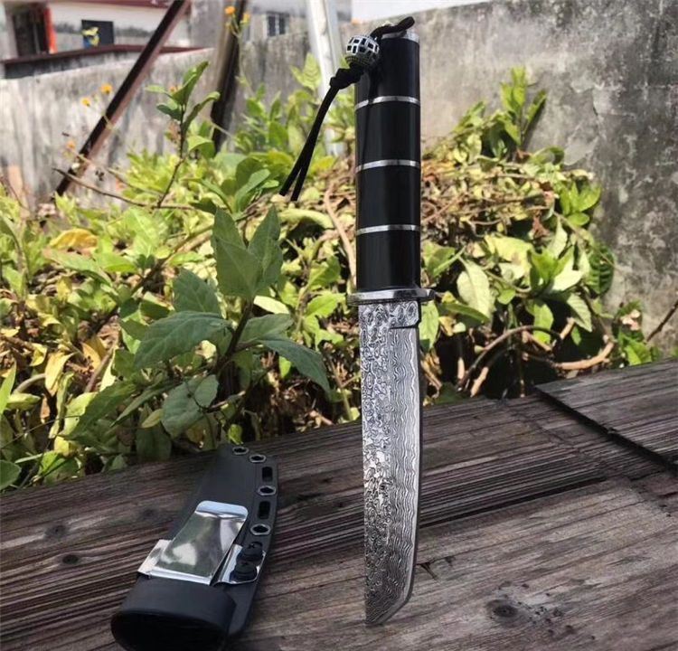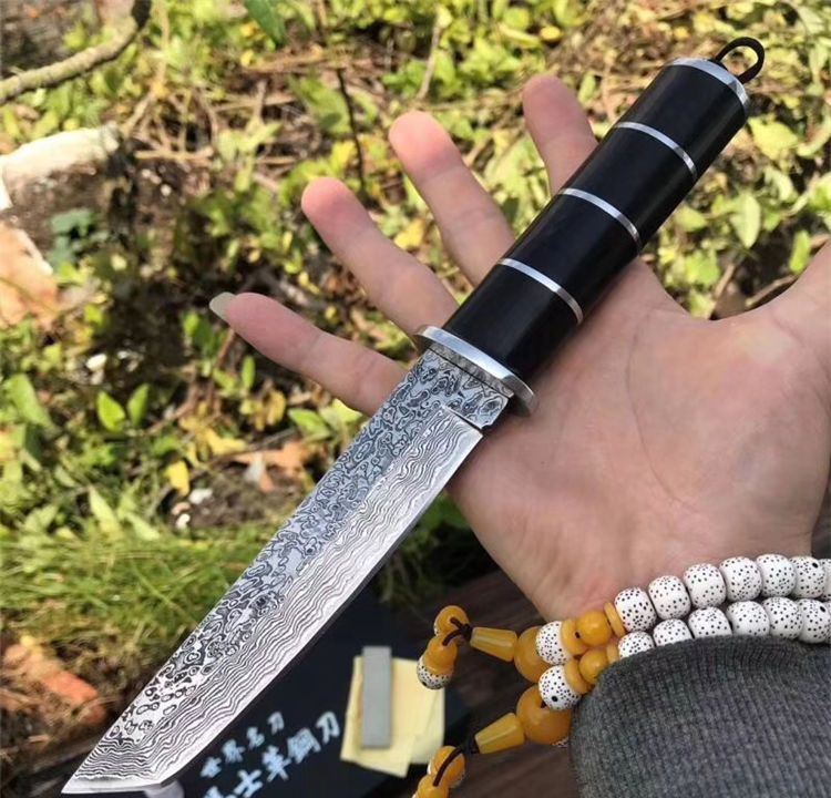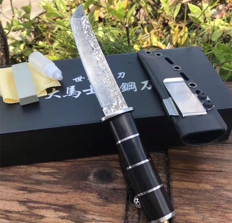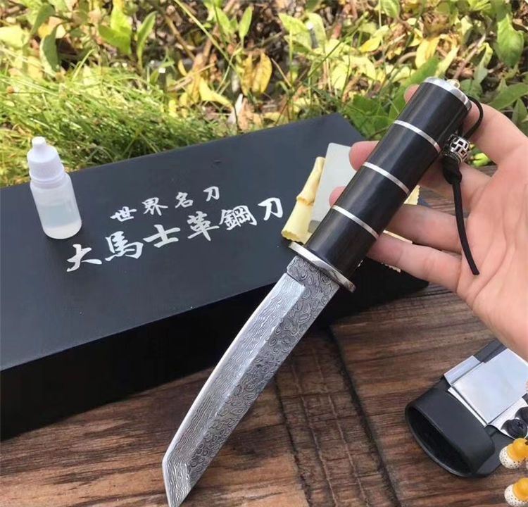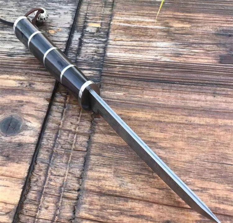 大马士革钢武圣博弈直刀 全长: 25.5cm 刃长: 13.5cm 柄长: 12.0cm 刃厚: 3.9mm 刃宽: 2.6cm 刃材:大马士革钢 硬度: 59-60HRC 重量: 约500g(含包装) 表面: 大马士革锻打雪花波浪纹原色 柄材:黑檀木+黄铜+不锈钢 配送:配送K鞘+名刀礼品盒+磨刀石+袜刀布+刀油+皮绳+银饰品