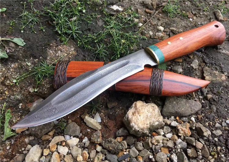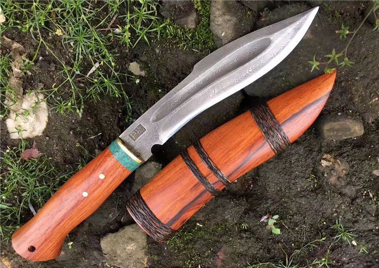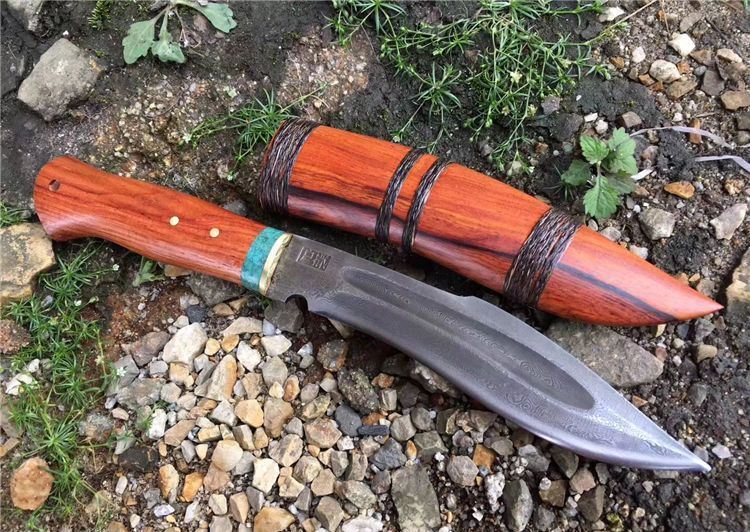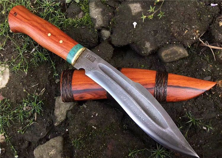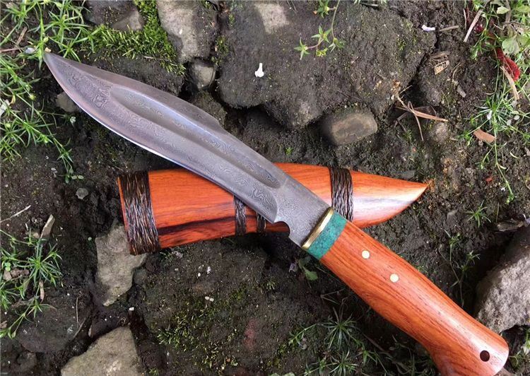 户撤百炼钢尼泊尔狗腿弯刀 全长:33cm 刀长:18cm 刀宽:3.3cm 刀厚:0.6cm 刀身材料为百炼折花钢 刀壳刀把为酸枝木,此刀锋利钢火好,手感好是一把非常不错的刀