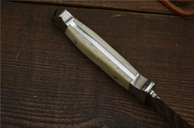 刃材:进口瑞典山特维克12C27 刃厚:3mm 刃宽:18.5mm 手柄:白牛骨/烤骨 涂层:镜面 长度:全长175mm 刃长: 84mm 硬度:HRC 60 重量:85克 配件:头层牛皮成型套、鳄鱼皮尾绳 包装:礼盒