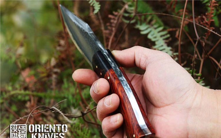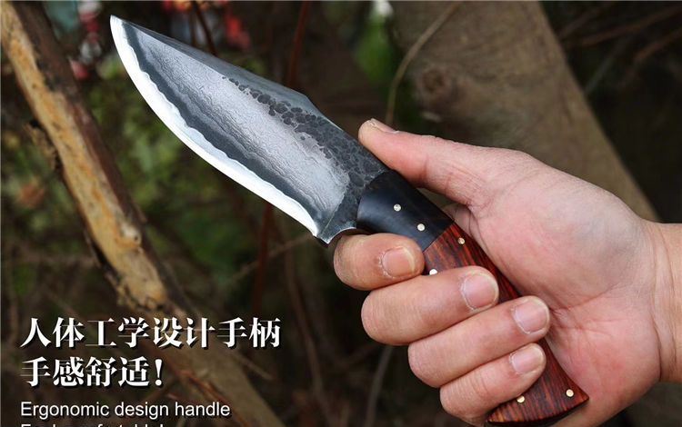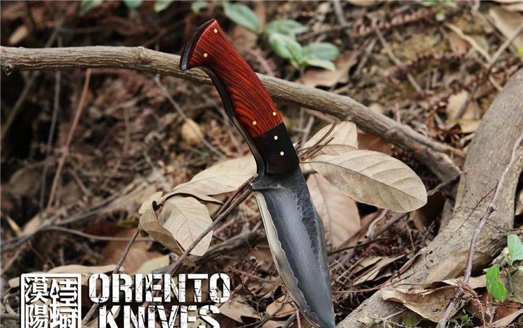 大马士革夹钢户外猎刀 全长:23.5mm 刃长:12cm 刃厚:6.5mm 重:320克 硬度:59-60 进口头层植鞣皮,新工艺