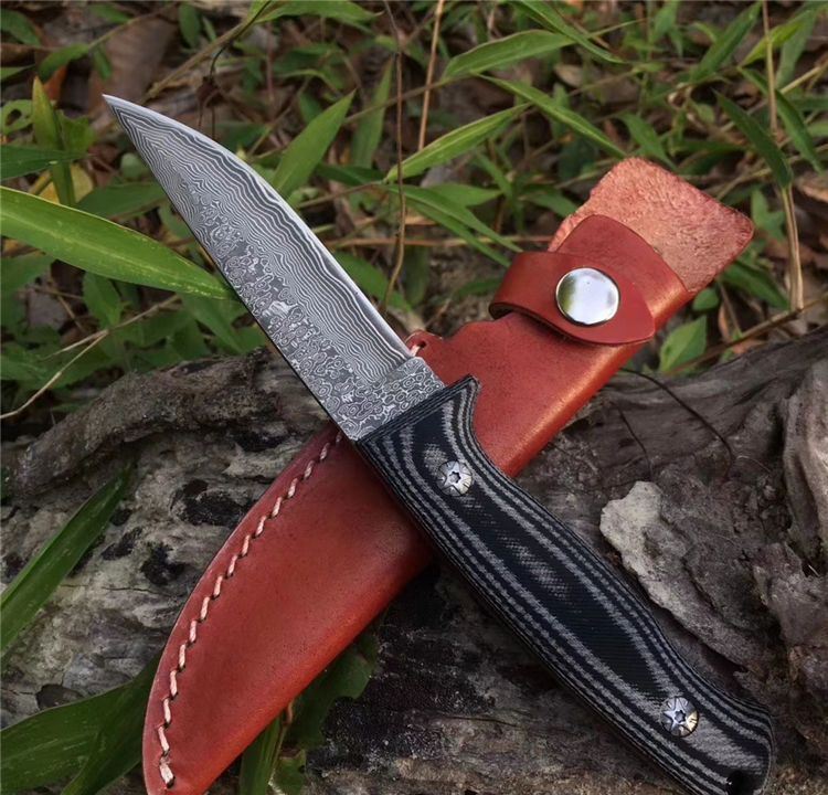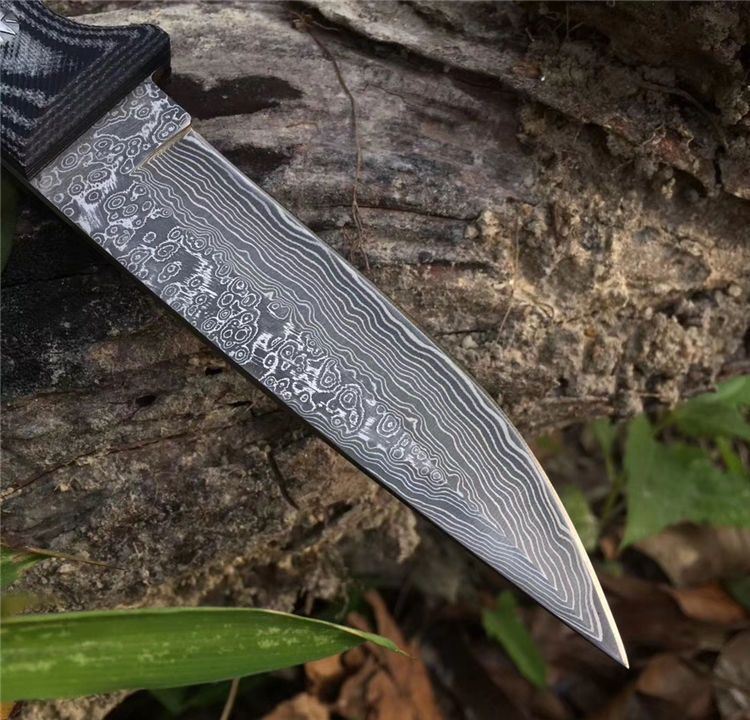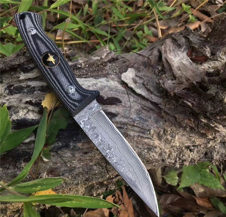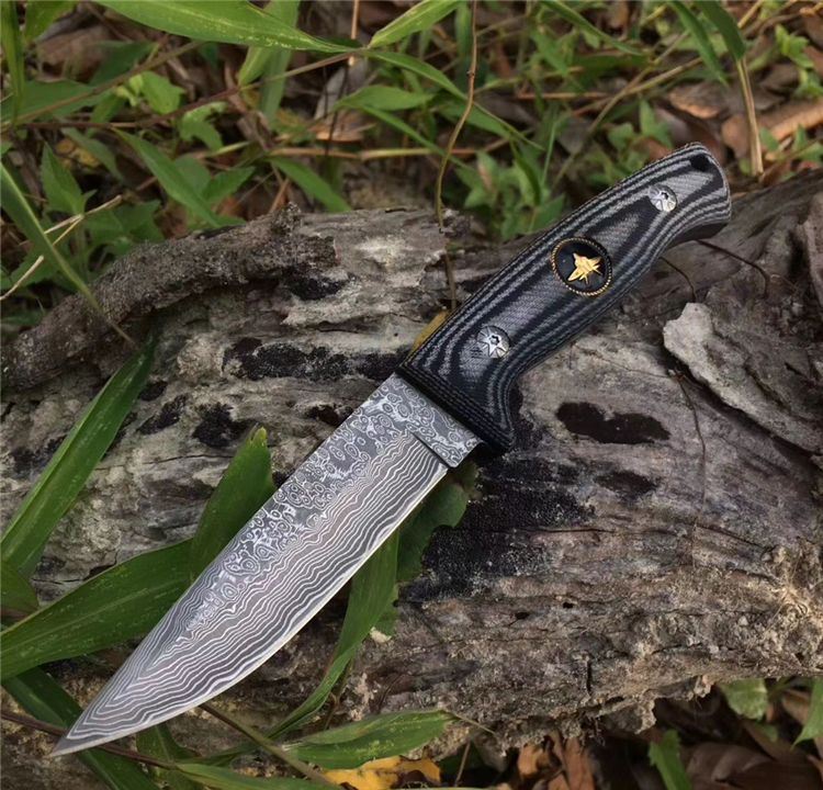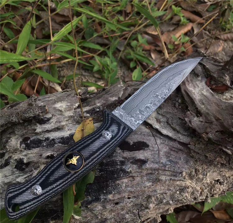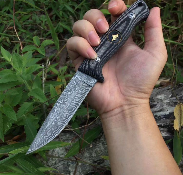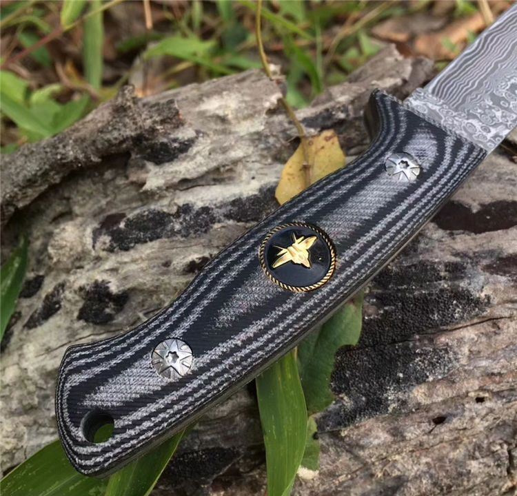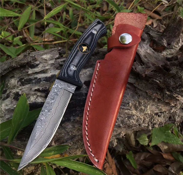 大马士革刀飞行员直刀 全长:21cm 刃长:9.5cm 柄长:12cm 刃宽:2.4cm(最宽处) 硬度:59HRC 柄材:米卡塔+镶制飞行员标志 重量:350克(含皮套) 刃材:大马士革VG-10钢材