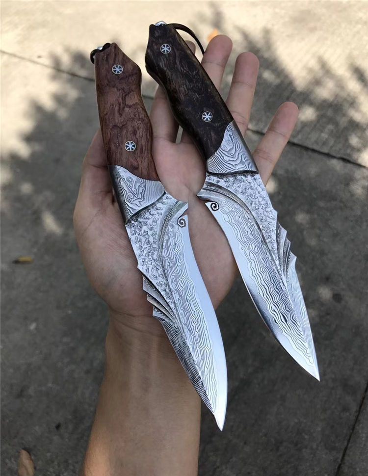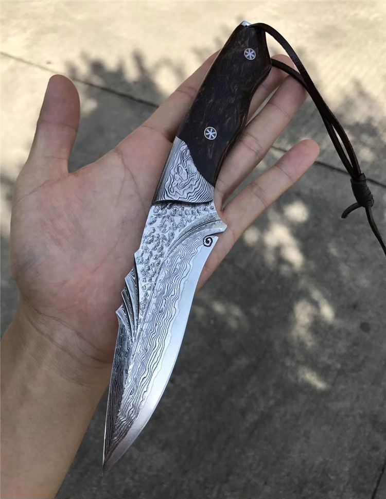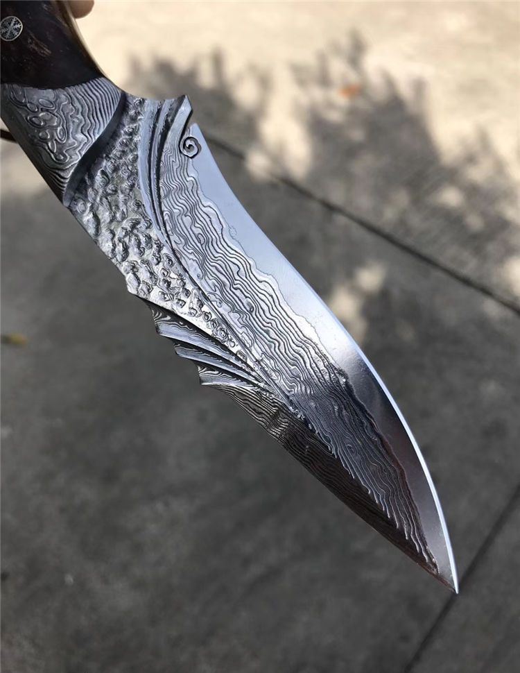 TUREN智者大马士革直刀 总长:约230MM 刃长:115MM 刃厚:约4mm 刃宽:4.5cm 钢材:日本夹层大马士革钢(进口钢芯层VG10钢73层) 硬度:60HRC 以锋利度为出色设计,热处理:真空深冷热处理技术,表面效果:折叠锻造形成花纹,钢头:纯铜雕花手工雕刻,柄材:进口巴花木稳定化,结构:一体龙骨,皮套:意大利优质进口植鞣皮,镶蛇皮与野生鳄鱼皮,老师傅纯手工雕花手工缝线皮套,国内一级工艺,包装:复古硬礼盒包装