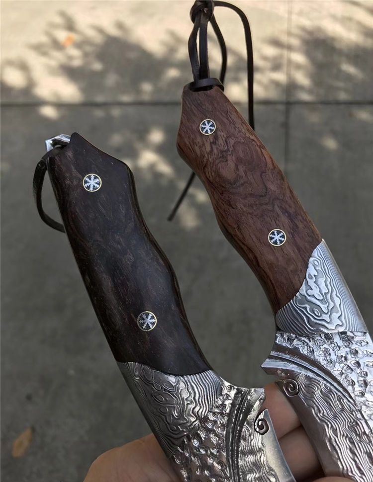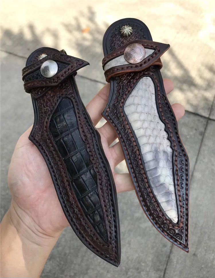以锋利度为出色设计,热处理:真空深冷热处理技术,表面效果:折叠锻造形成花纹,钢头:纯铜雕花手工雕刻,柄材:进口巴花木稳定化,结构:一体龙骨,皮套:意大利优质进口植鞣皮,镶蛇皮与野生鳄鱼皮,老师傅纯手工雕花手工缝线皮套,国内一级工艺,包装:复古硬礼盒包装