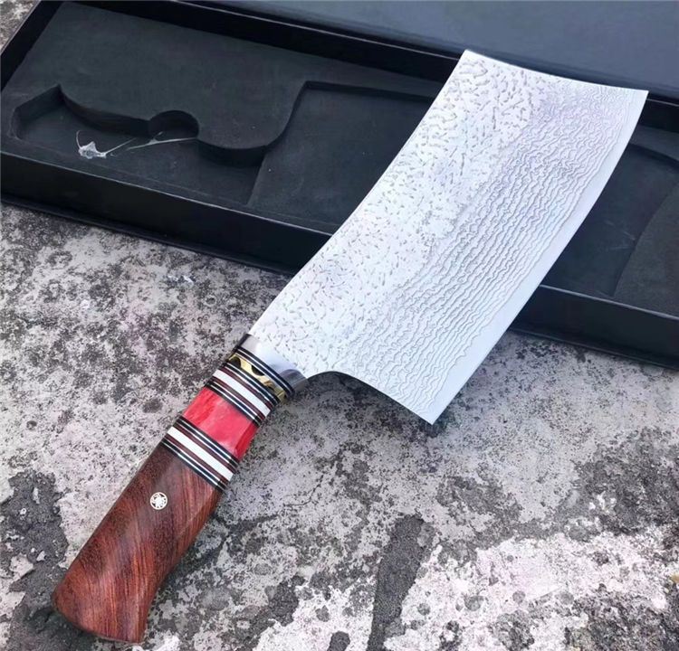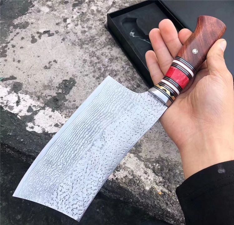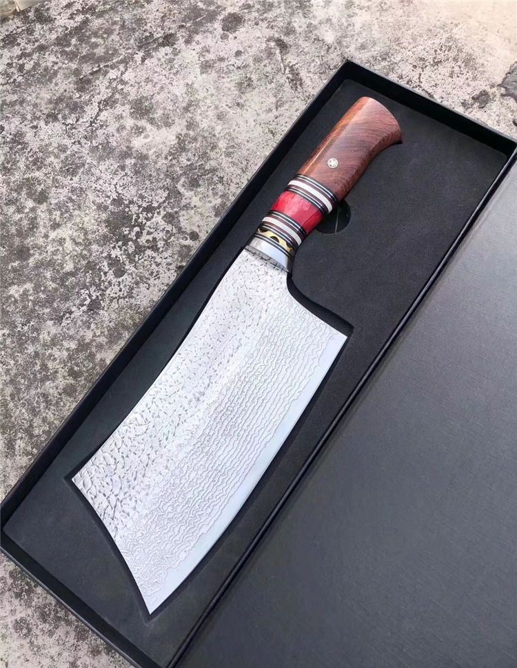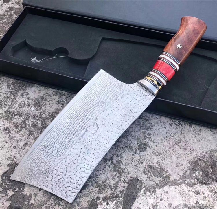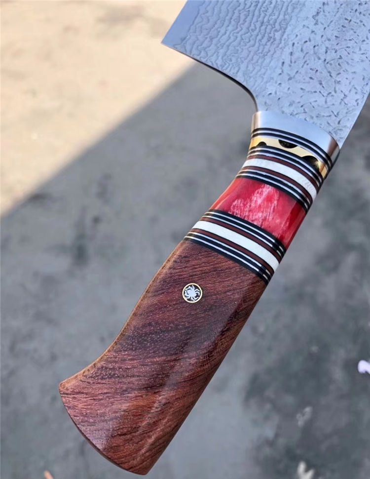 简师傅中式大马士革菜刀 总长:32cm 刃长:18.2cm 刃厚:3mm 刃宽:9cm 钢材:日本夹层大马士革钢(钢芯层VG10)90层 柄材:天然骆驼骨+巴瘤木+钢头+G10片+白牛骨