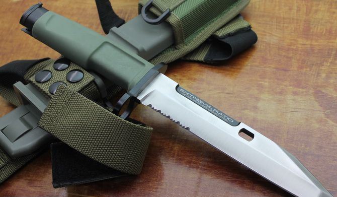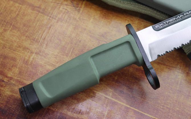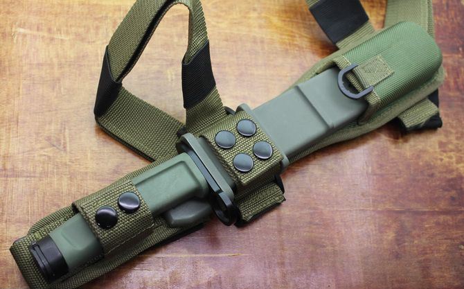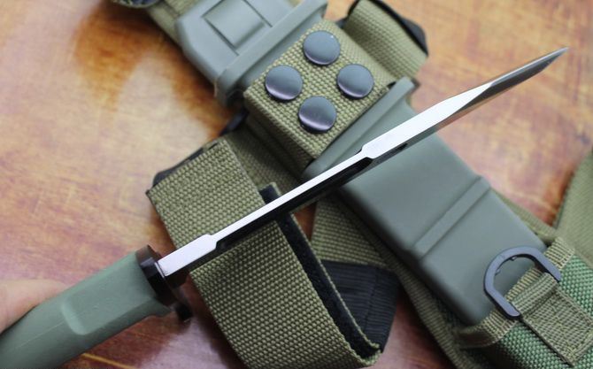 绿色超精仿极端武力阿富汗支点军刺 全长:31.2 CM 刃长:18.2 CM 刃厚:0.6 CM 刃宽:3.2 CM 硬度:58 HRC 柄材:玻璃纤维+Forprene 附件:尼龙刀鞘,绑腿 刺刀白刃多功能刺,带套火环,可装备M4/M16,刃面有刺刀口,可剪铁丝网(此功能是根据老毛子ak刺设计来的)非常经典,自带磨刀石,户外功能更加强大