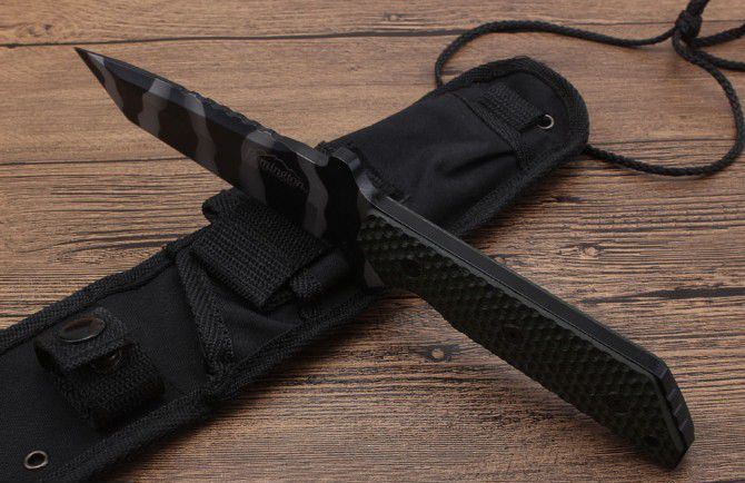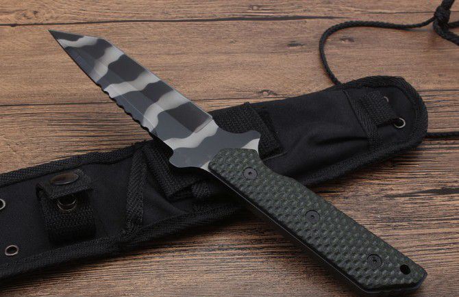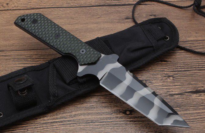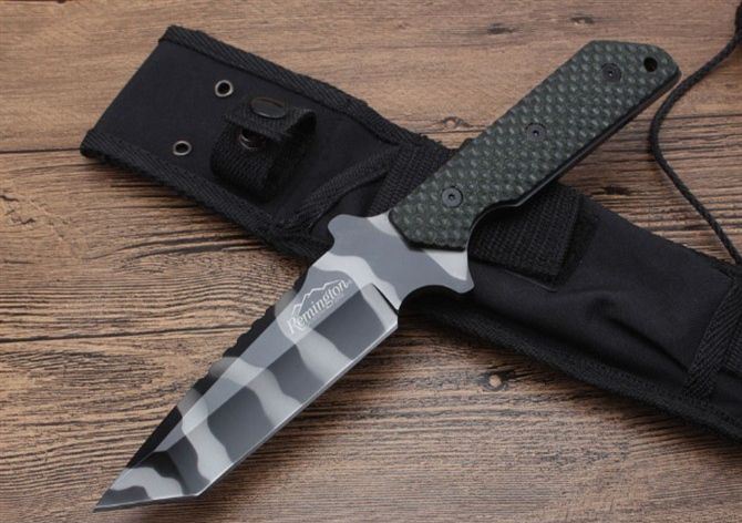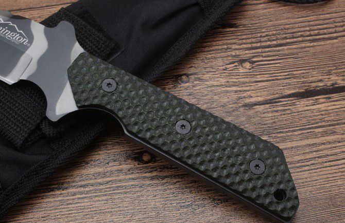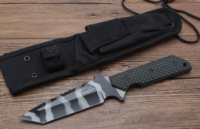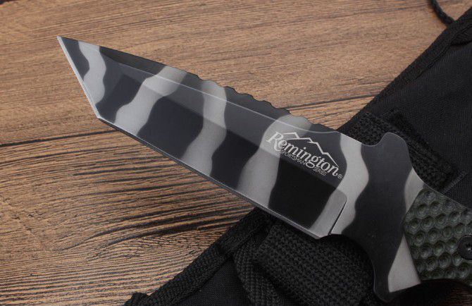 雷明顿战术求生直刀 全长:27.1Cm 刃长:12.1Cm 柄长:13.1Cm 刃宽:3.6Cm 刃厚:5.8mm 刃材:8CR18Mov 重量:469克毛重 硬度:60HRC 表面虎纹刃 柄材:一体钢+G10 锁型:定锁 其他:配尼龙绑脚套