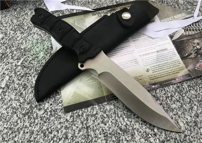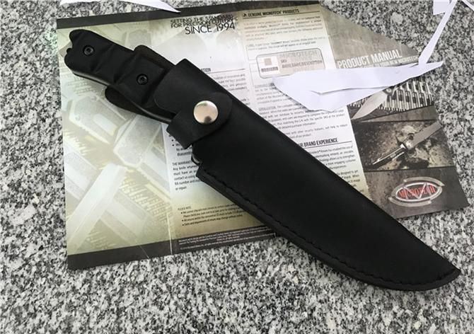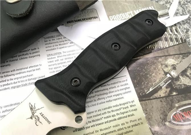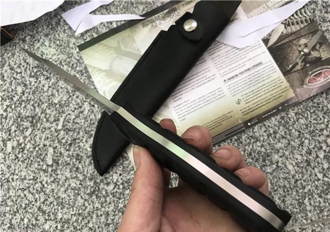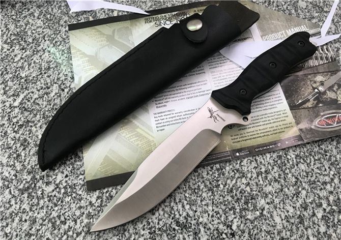 Shootey螳螂勇士直刀 品牌:shootey 全长:27.5cm 刃长:13.5cm 刃宽:3.5cm 刃厚:4.8mm 刃材:440高级不锈钢 硬度:58HRC 表面:砂光 柄材:米卡塔 柄长:12cm 鞘材:真皮套 刀重:310克 总重:580克