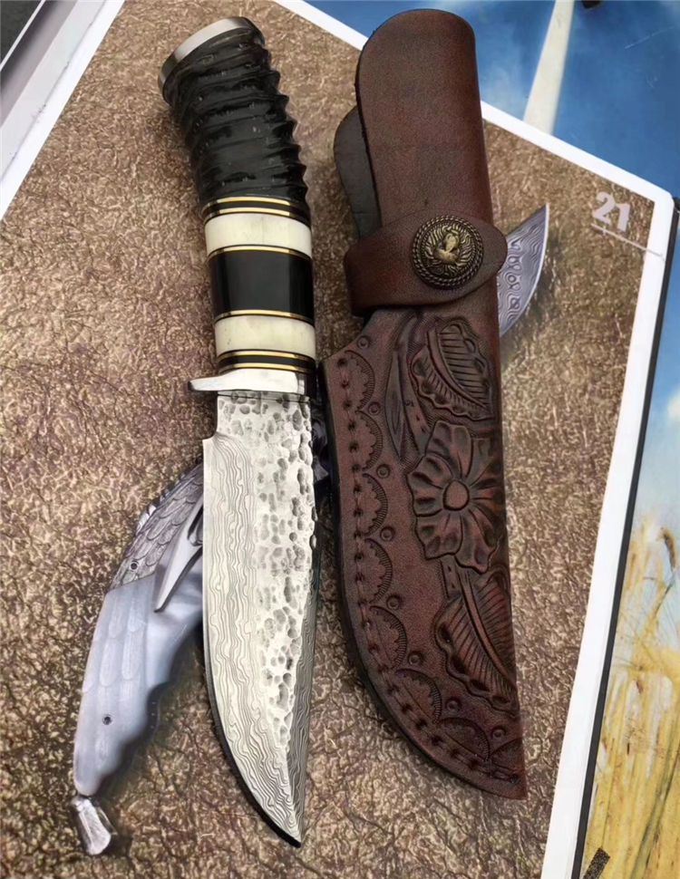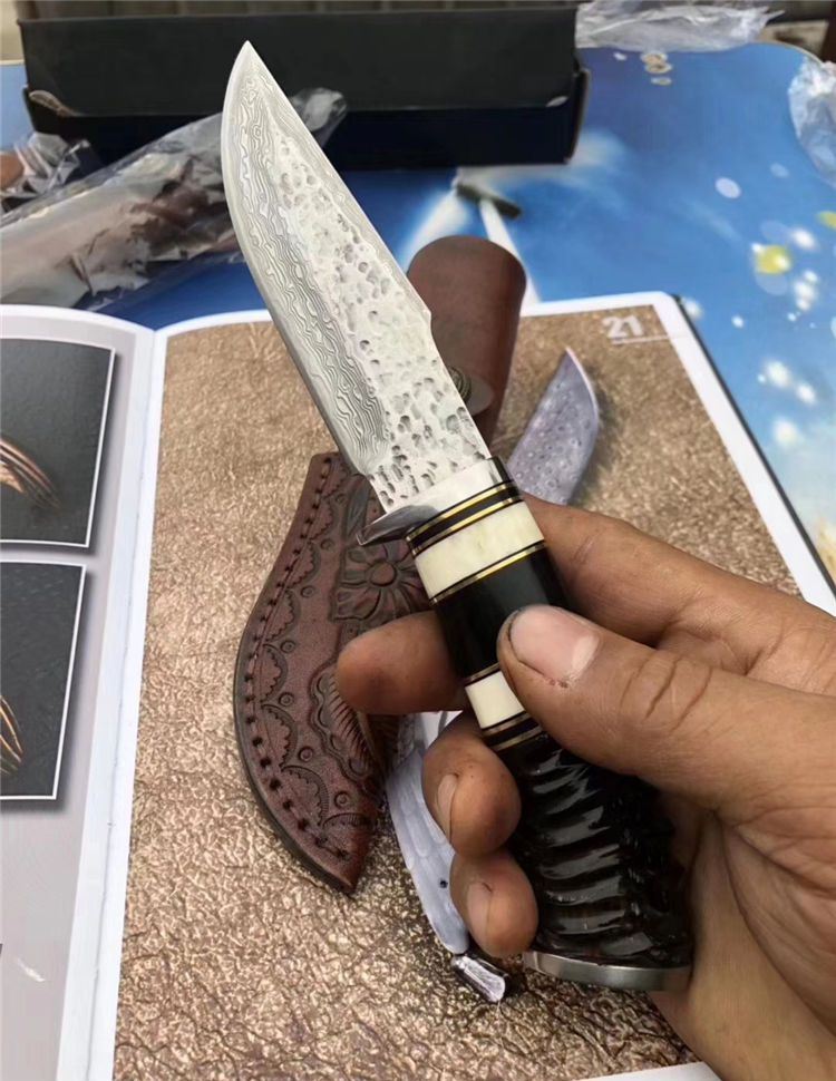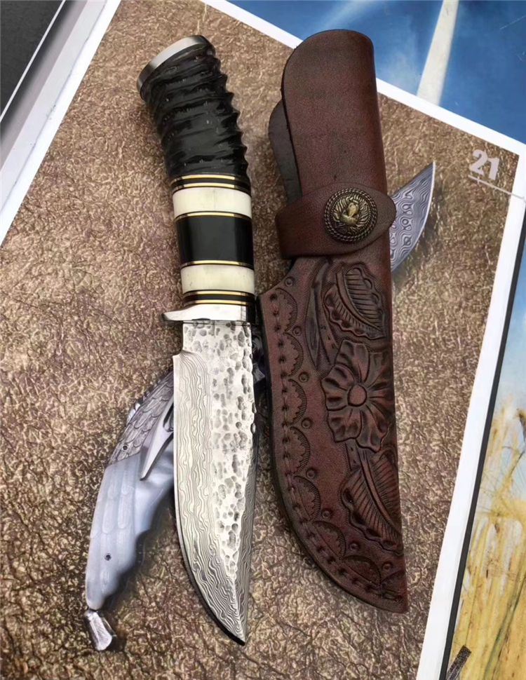 大马士革牛骨直刀 全长:22.5cm 刃长:11.5cm 刃宽:3.2cm 刃厚:0.38cm 牛骨黑檀木羊角组合手柄