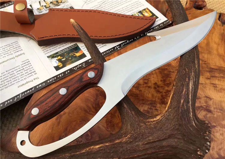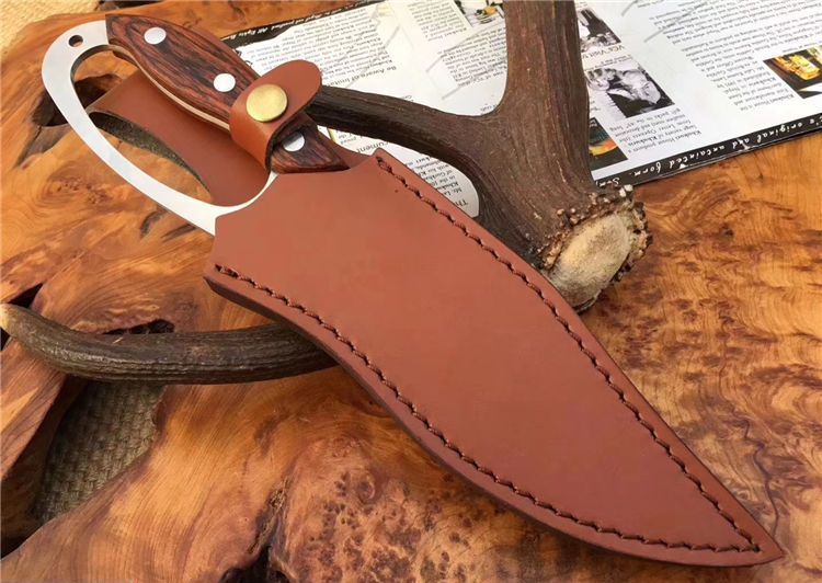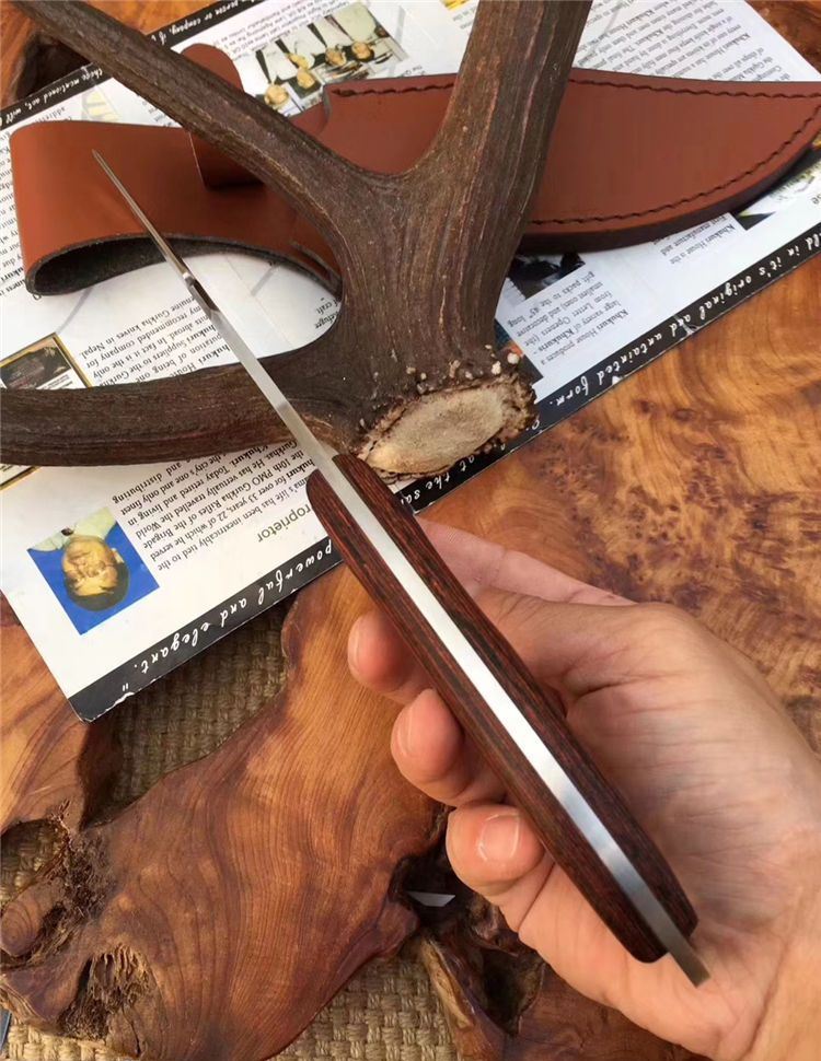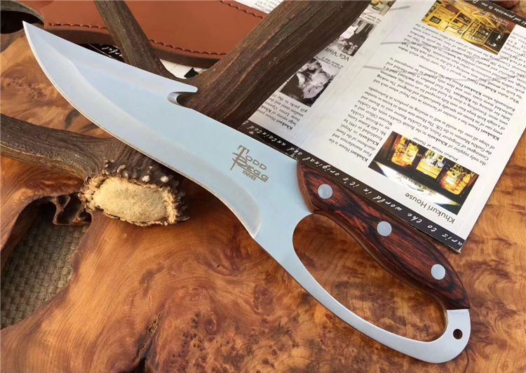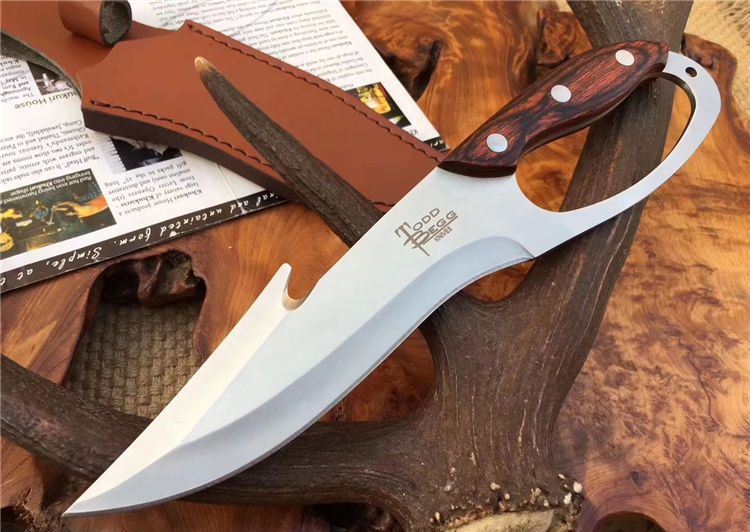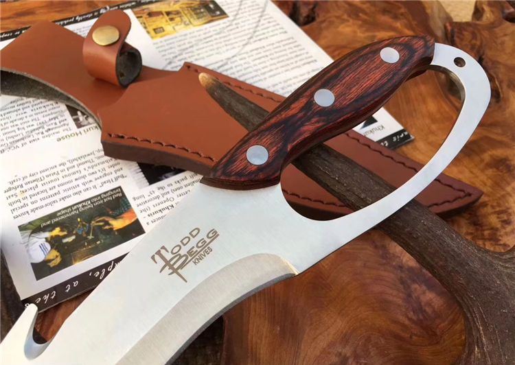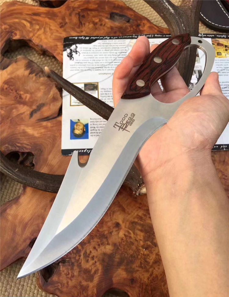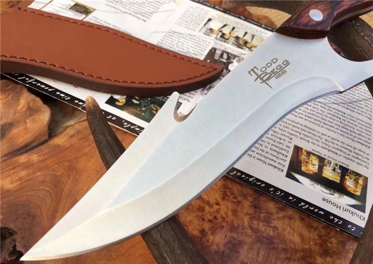 托德贝格升级版手环刀 全长:285mm 刃长:166mm 柄长:128mm 刃宽:45mm 刃厚:4mm 刃材:8Cr18Mov 重量:350g(含包装) 硬度:59HRC 表面:沙光 柄材:彩木 锁型:定锁 其他:配皮套