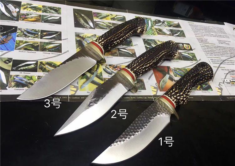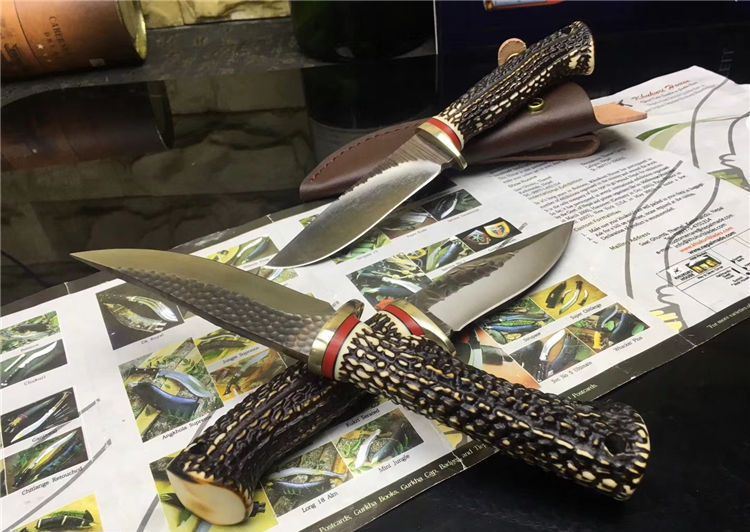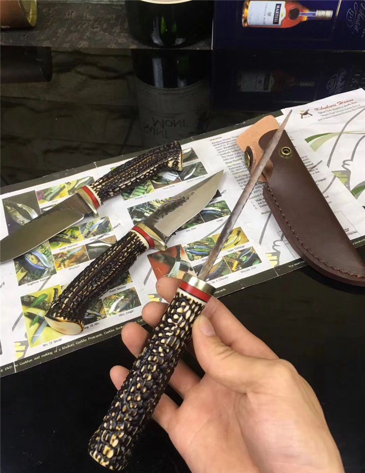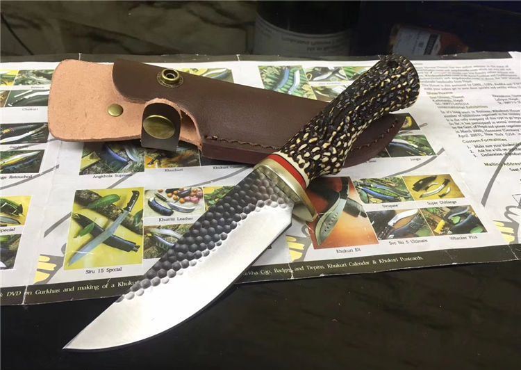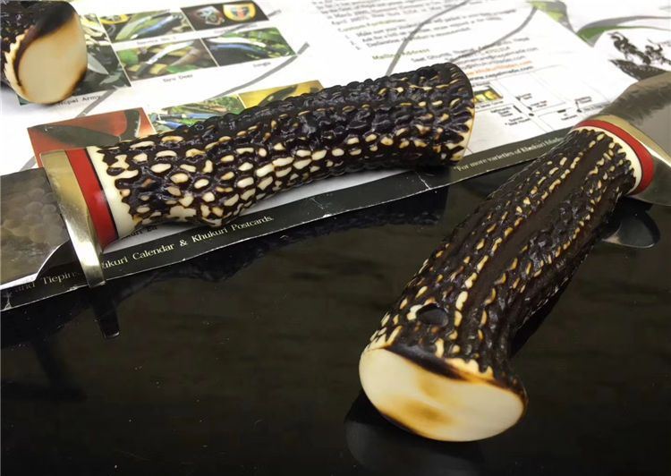 锻打花鹿直刀 全长:25.5cm 刃长:13cm 手柄:12.5cm 钢材厚度:4.2mm 柄材:树脂仿鹿角 材质:锻打钢