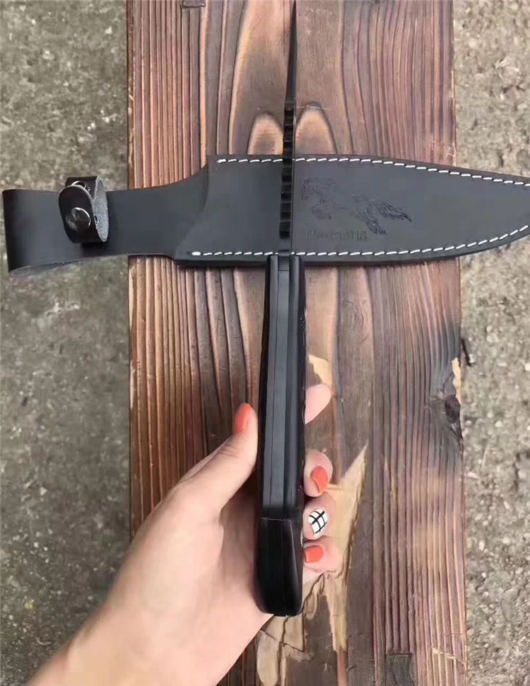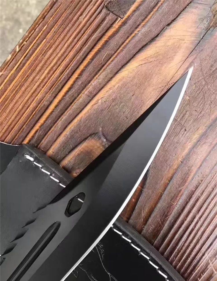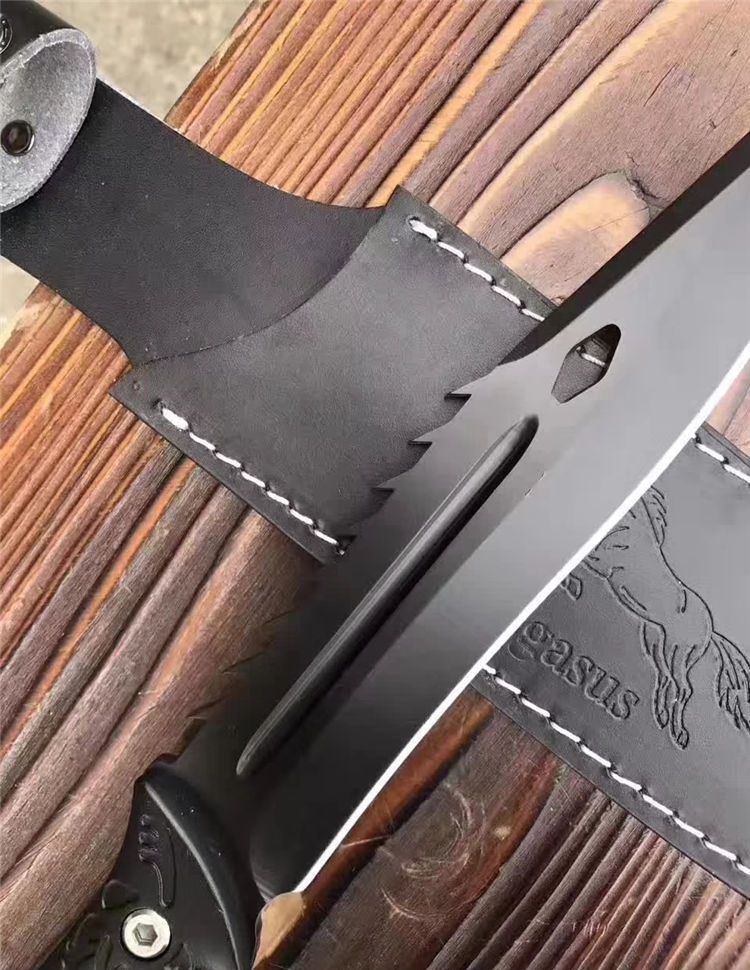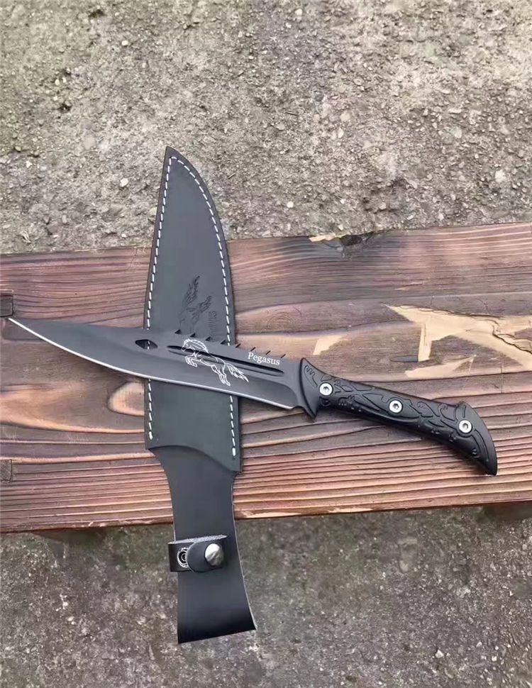 野马战术直刀 全长:35.5cm 刃长:23cm 柄长:12cm 最宽处:5.5cm 刃厚:0.6cm 重量:560g 配送牛皮套