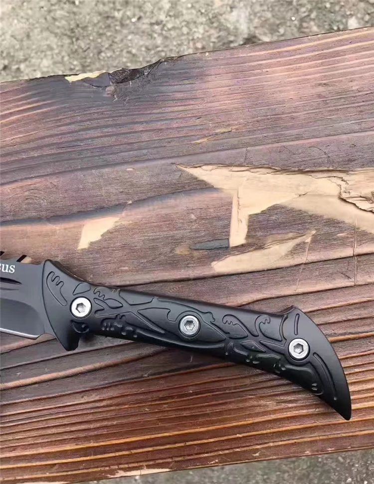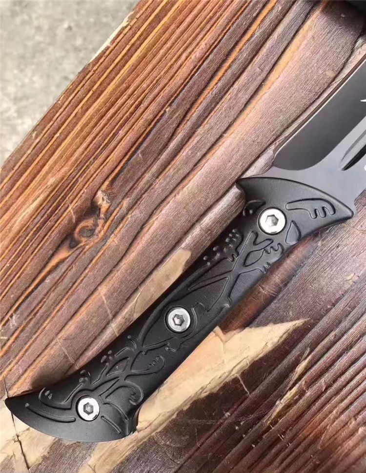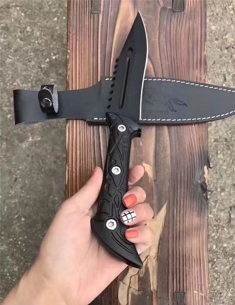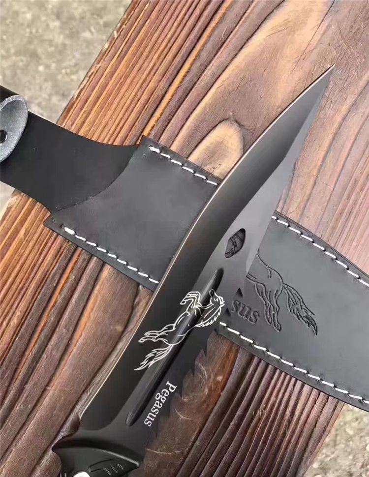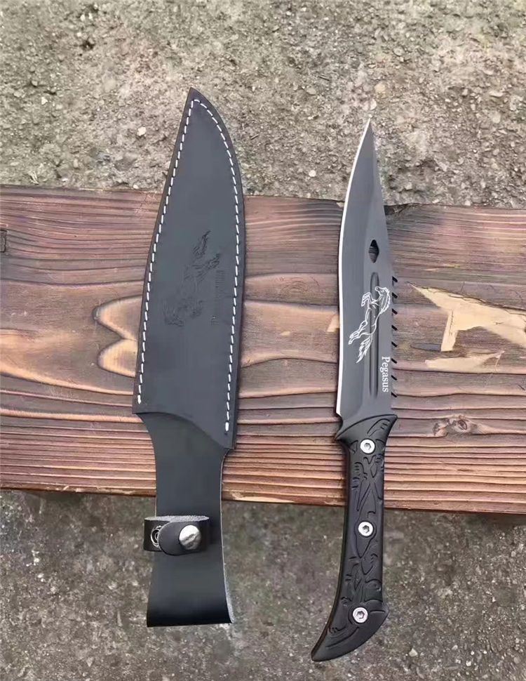 野马战术直刀 全长:35.5cm 刃长:23cm 柄长:12cm 最宽处:5.5cm 刃厚:0.6cm 重量:560g 配送牛皮套