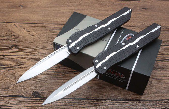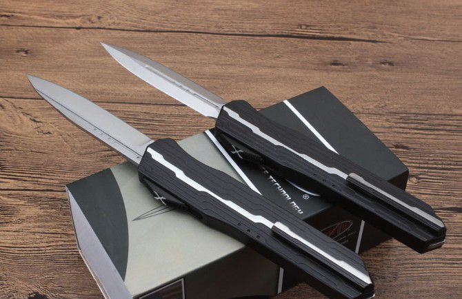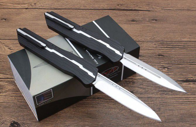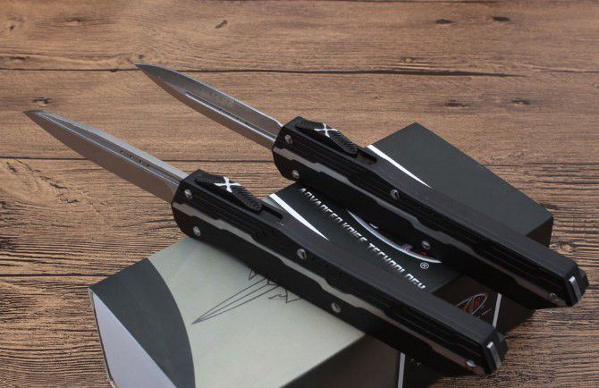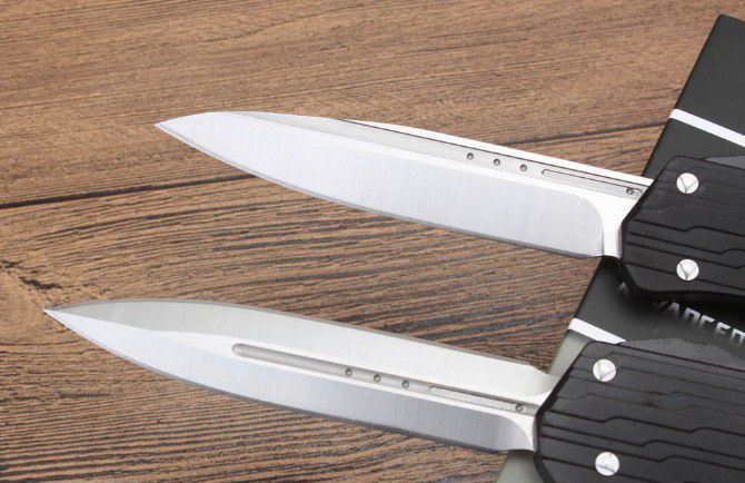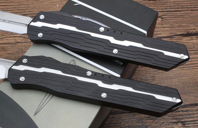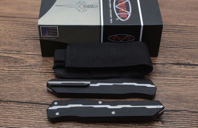 二代复刻微技术暗码天启跳刀 总长度:240mm 刀片长度:97mm 刀片厚度:3mm 刀片宽度:20mm 手柄长度:140mm 手柄厚度:12mm 刀片材质:D2 表面处理:缎面 手柄材料:7075铝 硬度:59-61HRC 净重:123克 附件:尼龙套,说明书,彩盒
