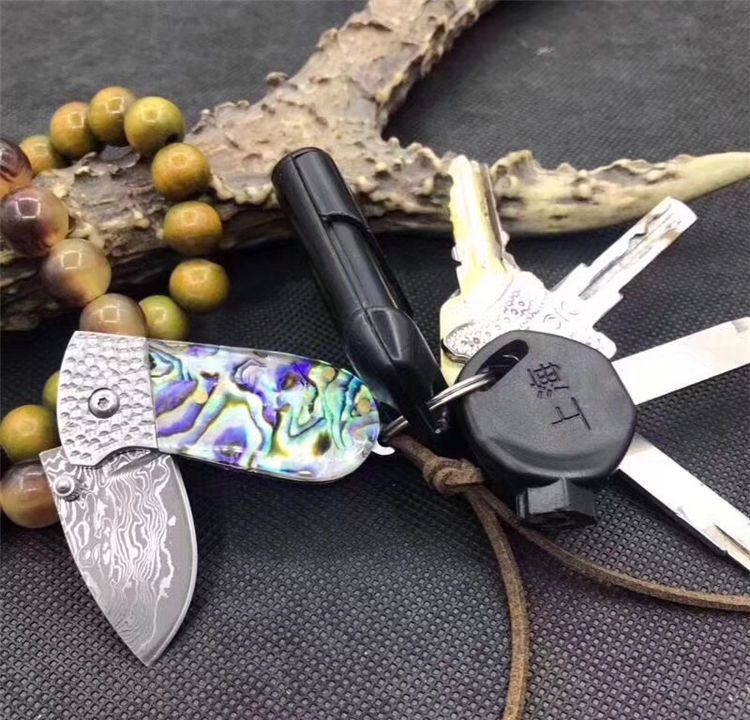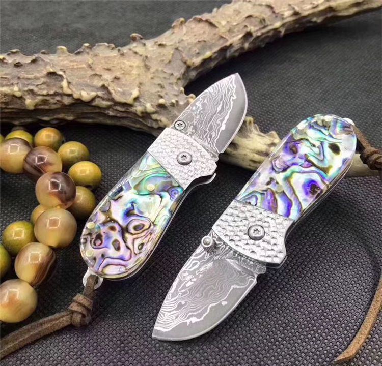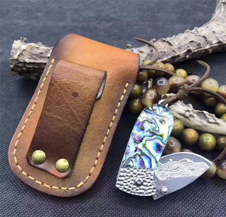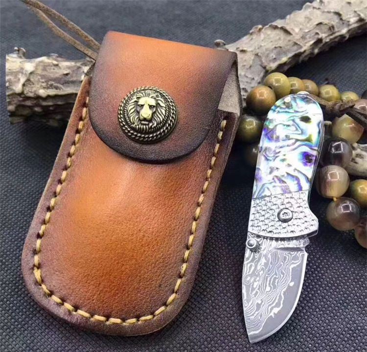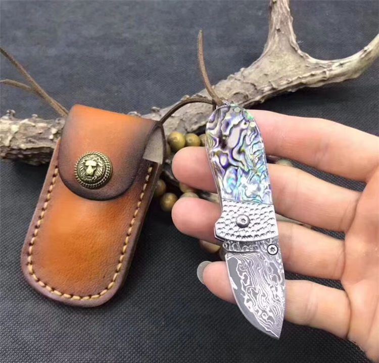 大马士革小珍珠折刀 全长:9.3cm 刃长:3.5cm 柄长:5.8cm 刃厚:2.5mm 刃宽:2.0cm 刃材:进口大马士革钢 硬度:58-60HRC 重量:约75克(含包装) 表面:锻打吉祥如意花纹原色 柄材:鲍鱼贝壳+不锈钢+黄铜 配送:高级礼品盒+意大利手工雄狮皮套+牛皮绳