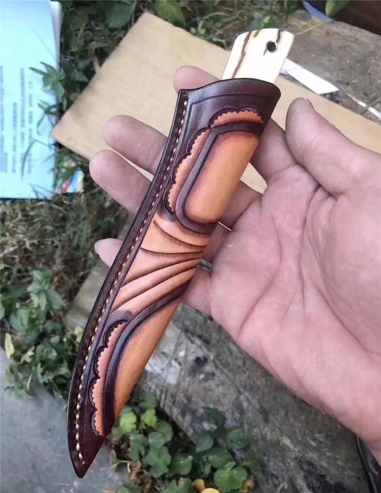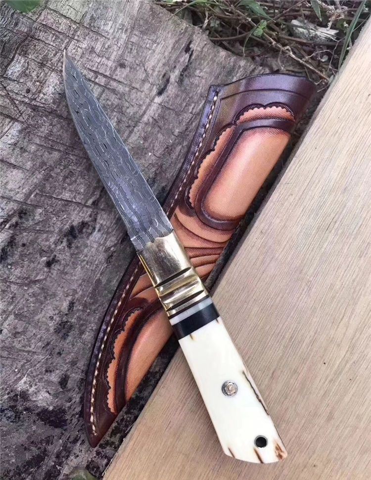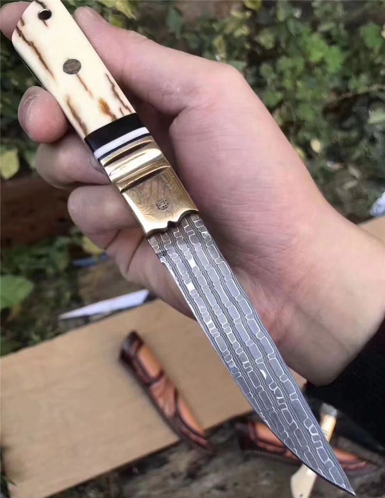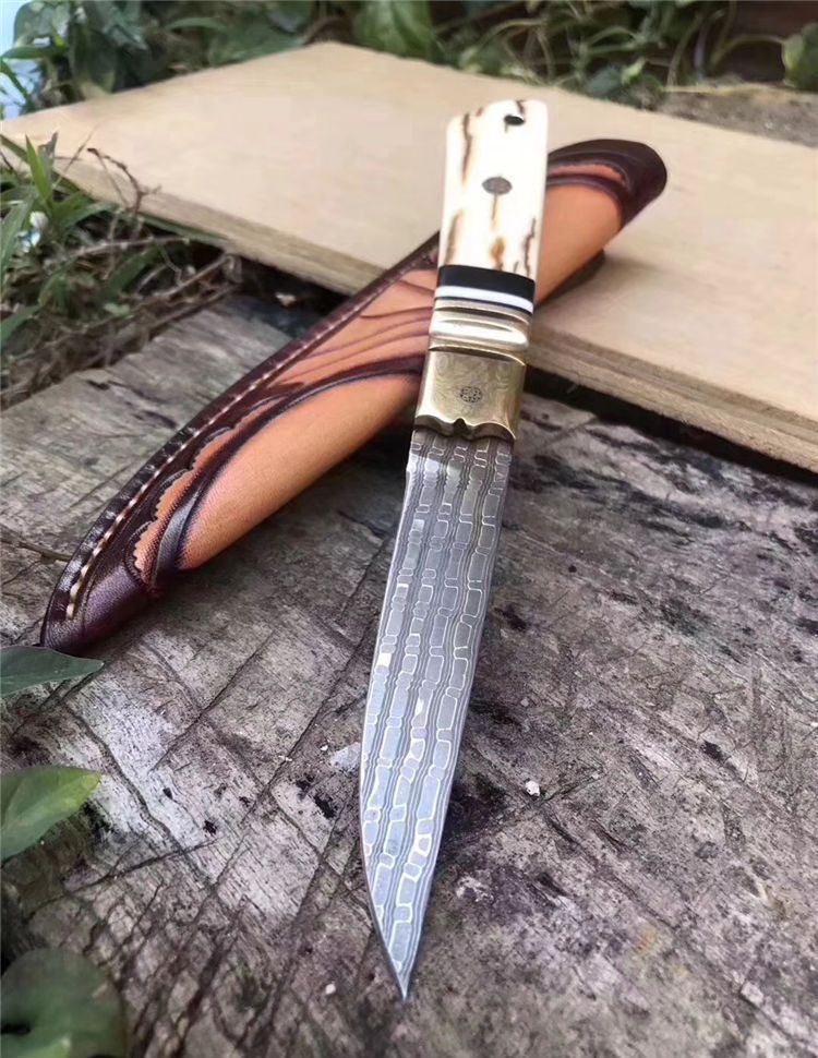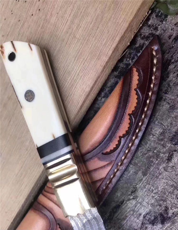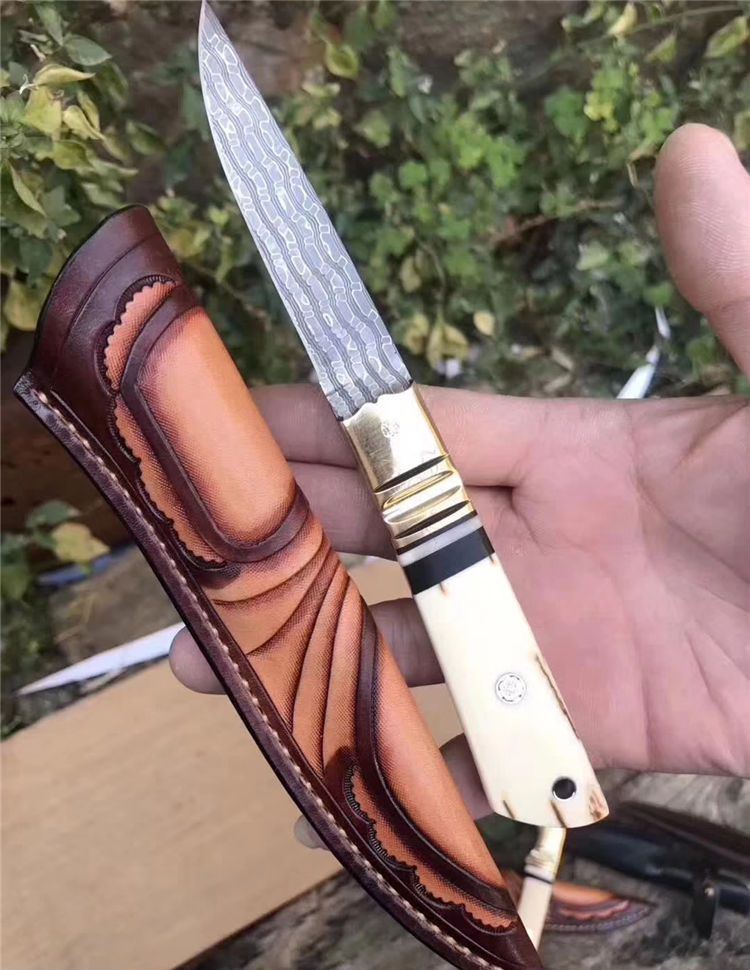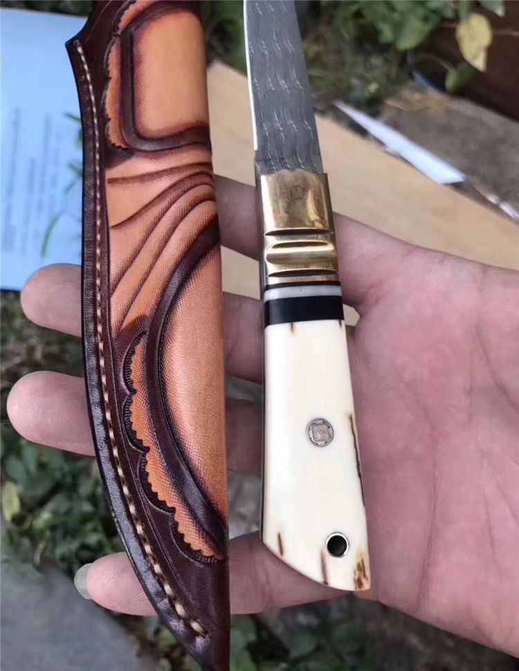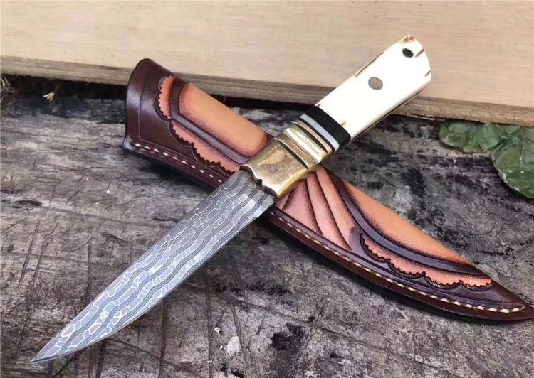 进口托马斯大马士革手工猎刀 全长:185cm 刃长:8.5cm 刃厚:3.1cm 刃宽:16mm 硬度:58~60HRC 全猛犸牙搭配钢头大马铜。(托马斯刃进口钢,搭配进口花梨樱木+万年猛犸。刃材:托马斯刃 全进口。柄材:猛犸牙+大马铜+黑檀。头层牛皮手缝刀鞘。户外家用锋利型小刀、随身刀。送礼佳品,纯手工制作,美观、锋利、耐用。好产品要收藏一把的