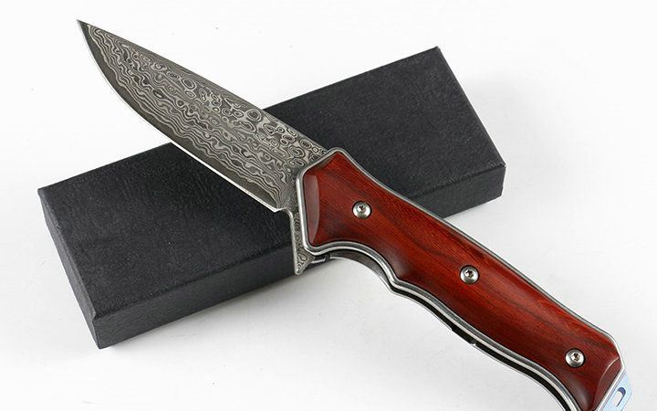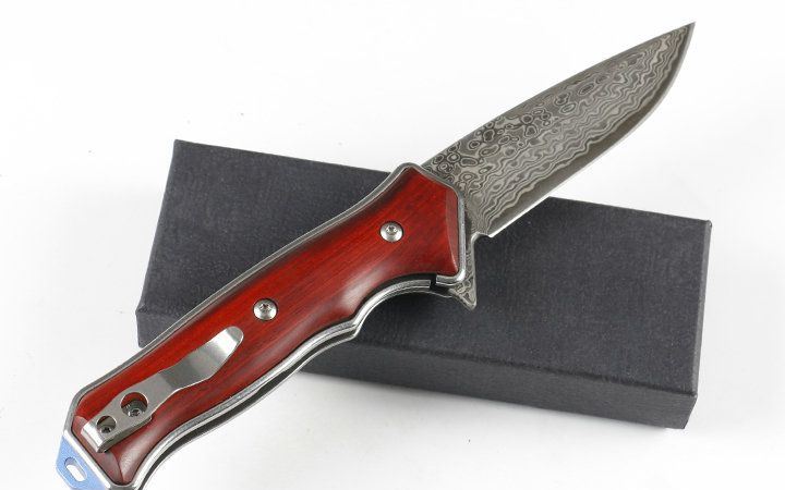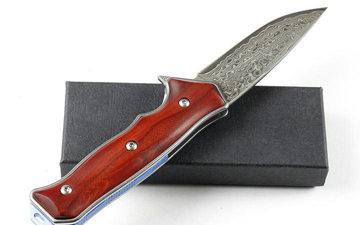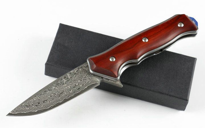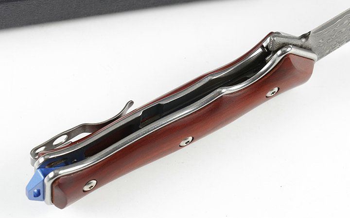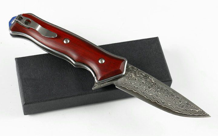 大马士革蓝色边缘折刀 品名:大马士革 全长:21.2cm 刃长:8.5cm 柄长:12.7cm 刃宽:2.7cm 刃厚:3.5mm 刃材:VG10大马士革钢 重量:165g(含包装) 硬度:56-58HRC 表面:VG10大马士革原纹。 柄材:天然紫粒红檀木. 锁型:侧锁 其他:黑色礼盒,出口装,内置轴承,开合顺畅