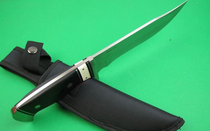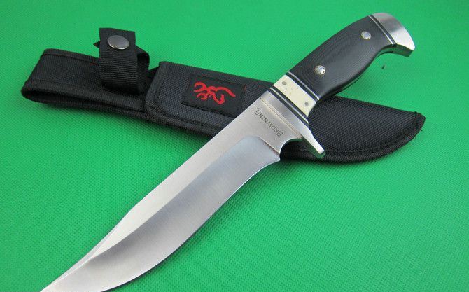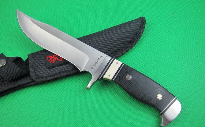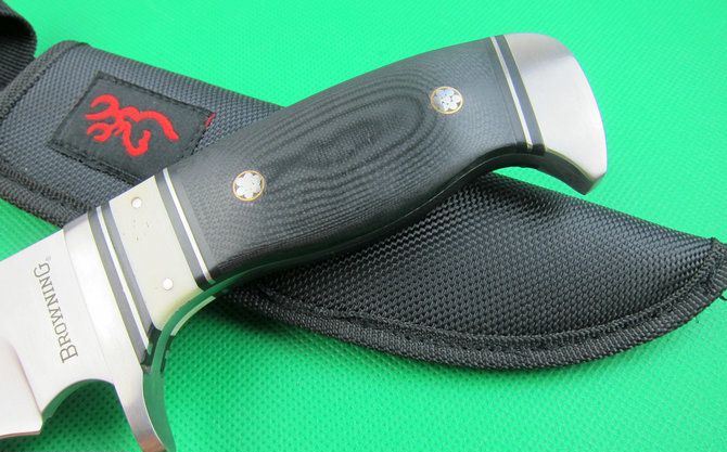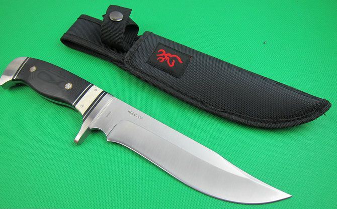 勃朗宁512直刀(盒装外贸品) 全 长:31cm 刃 长:17cm 柄 长: 12.5cm 刃 宽:3.8cm(最宽处) 刃 厚:4.4mm 刃 材:7CR17MOV 硬 度:57HRC 刀 柄:钢头+骆驼骨+米卡塔 表 面:砂光 重 量: 390克 总 重;530克 备 注: 带尼龙套