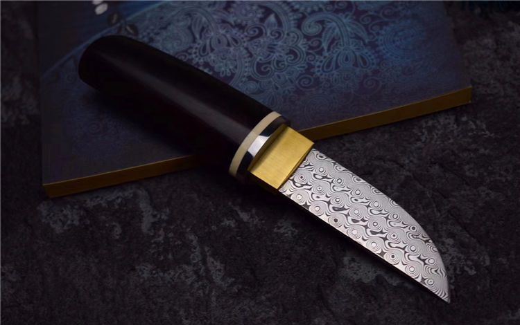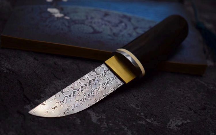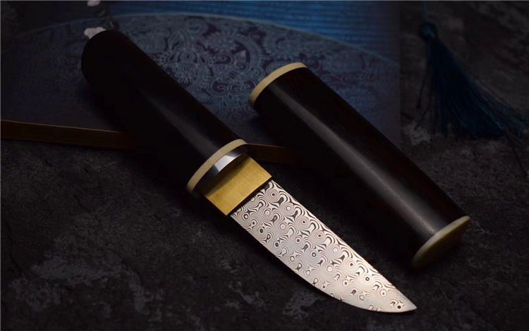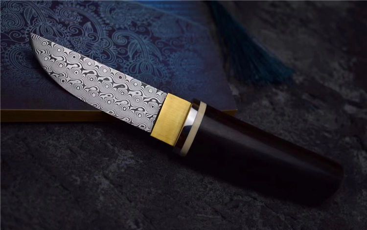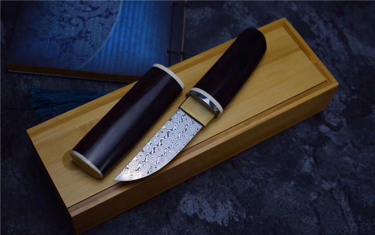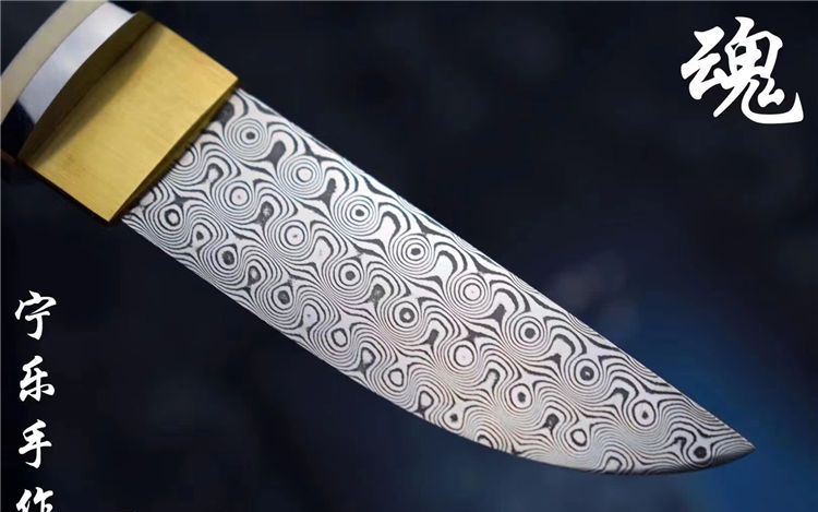 大马士革迷你高端小宝剑魂 全长:190MM 刃长:90MM 刃宽:25MM 刃厚:4MM 刃材:无钢芯大马士革钢(95层) 硬度:60+HRC 表面:纯手工打磨抛光 柄材:紫光檀木+牙料+不锈钢和黄铜固定 配套:精美竹盒+羊皮套