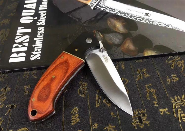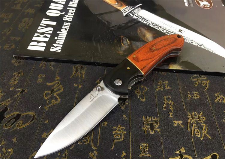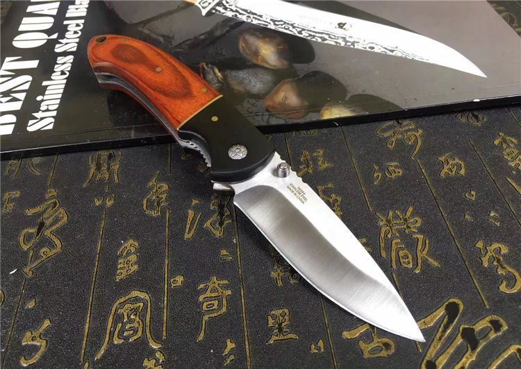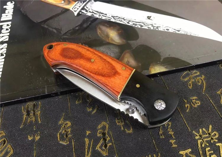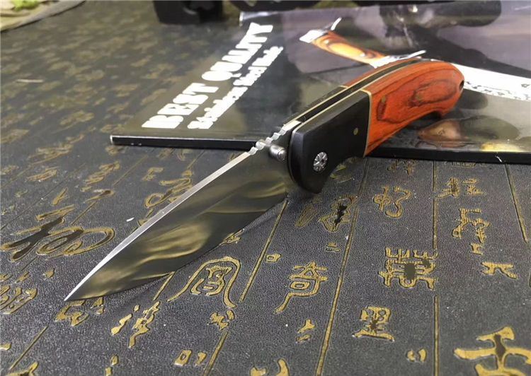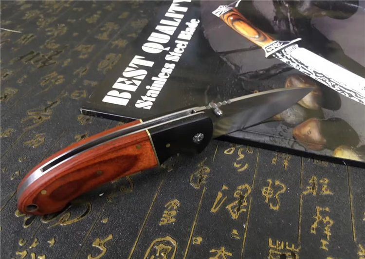 双木折刀 全长:215mm 刃长:95mm 柄长:120mm 刃宽:26mm 刃厚:2.9mm 刃材:5CR15 重量:200g (含包装物) 硬度:58HRC 表面:砂光 柄材:乌木+彩木