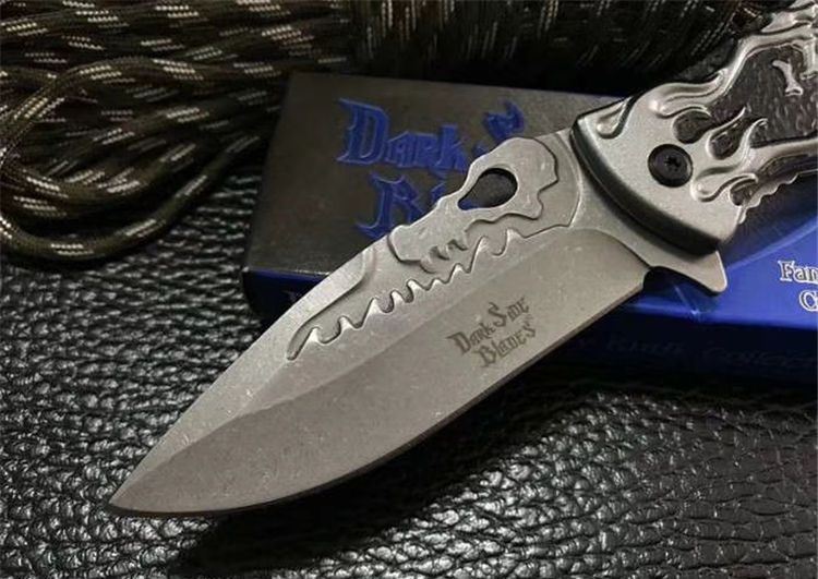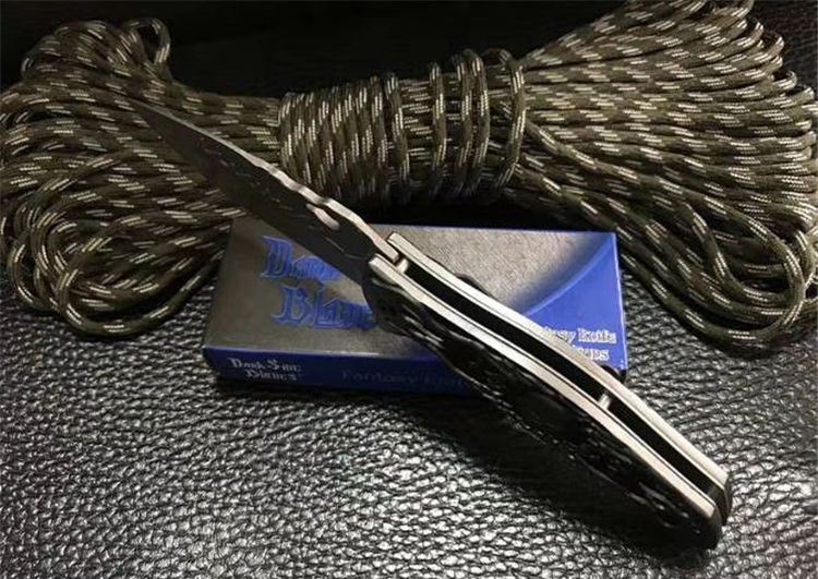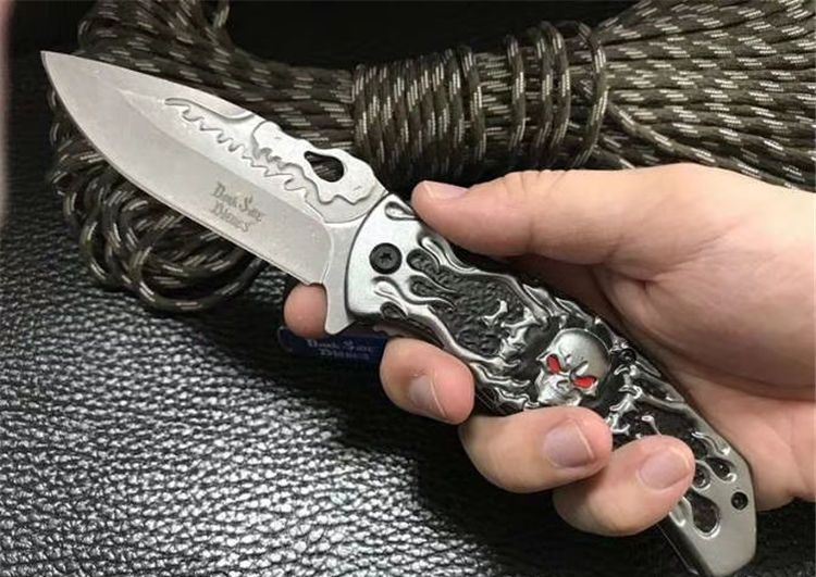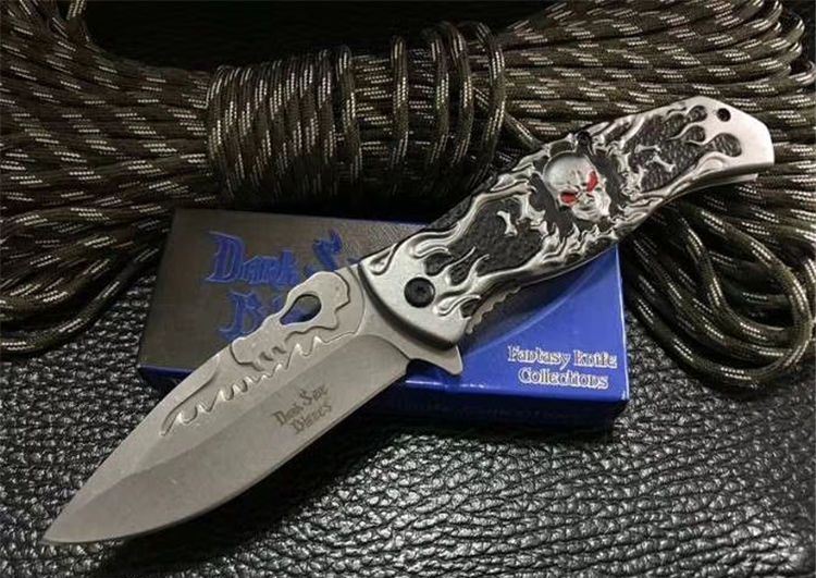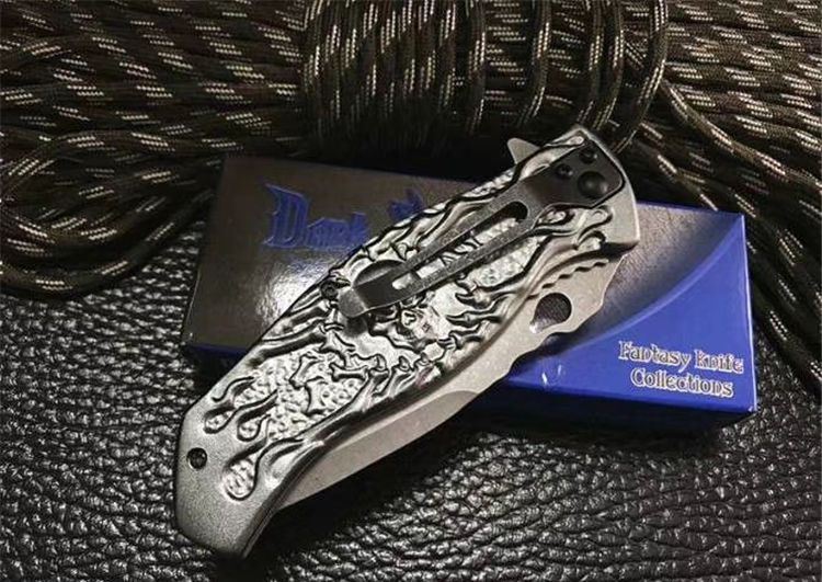 地狱使者折刀 全长: 22cm 刃长: 9.5cm 刃宽: 3.2cm(最宽处) 闭合: 12cm(柄长) 刃材: 440C 硬度: 57 表面: 砂光 刃厚: 0.3cm 柄厚: 1.2cm 柄材: 钢 净重: 150克 包装:彩色纸盒