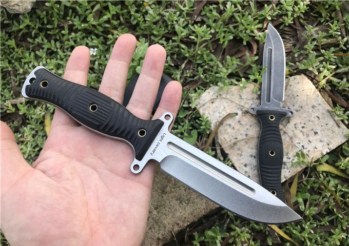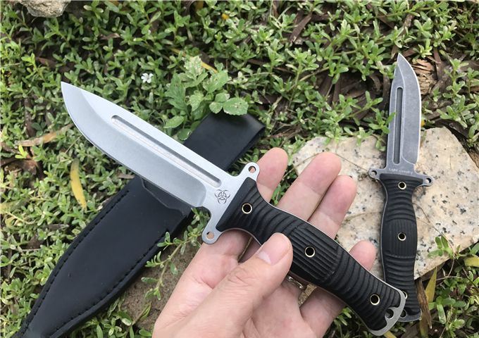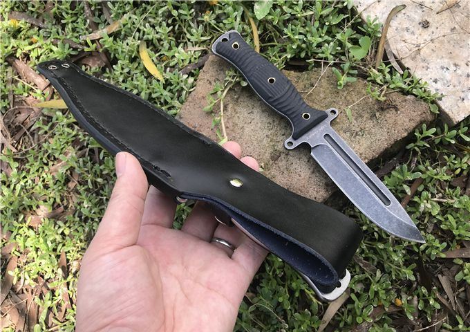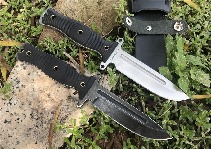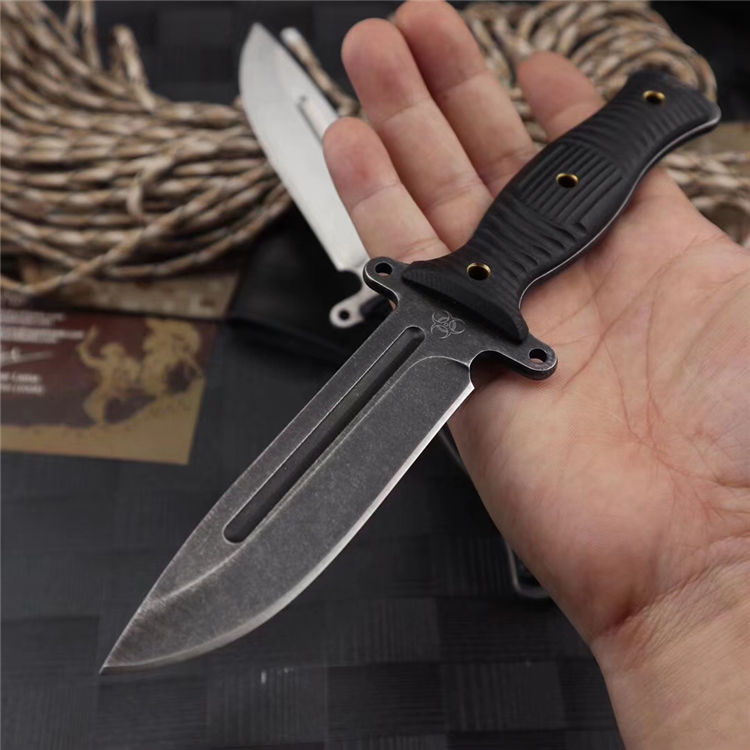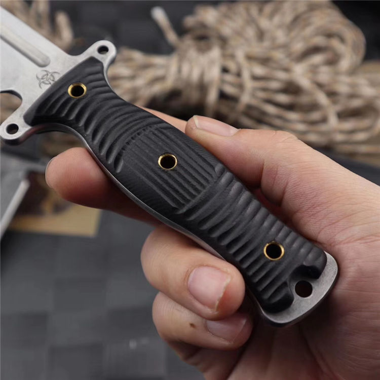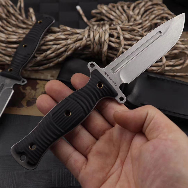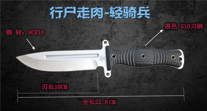 行尸走肉轻骑兵直刀 全长:22.8MM 刃长:10MM 刀柄:10.8MM 刃厚:0.4MM 刃面打磨:数控V磨 刃面处理:石洗和沧桑石洗 热处理:真空油淬热处理 硬度:59HRC 材料:9CR18钢材 柄材:黑色G10 刀鞘:皮套 刀重:约168G 总重:约220G