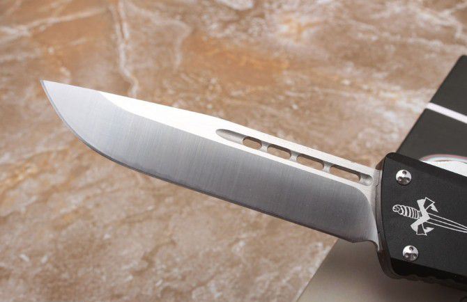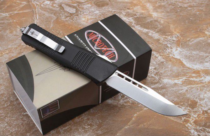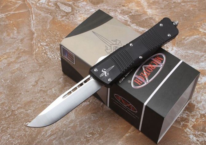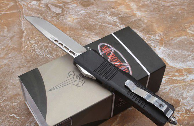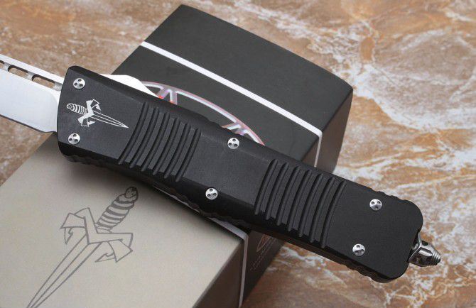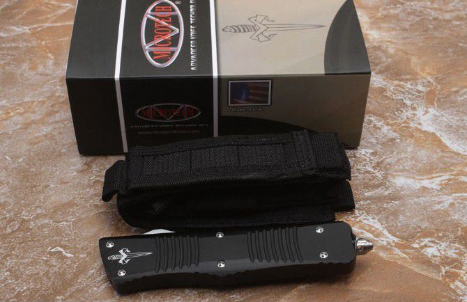 微技术防滑柄水滴刃直出跳刀 全长:24CM 刃长:9.6CM 柄长:14.6CM 刃材料:D2 刃型:水滴刃 刃表面:缎光面,CNC磨 柄材料:T6061航空铝,硬质氧化 重量:160g 刀鞘:战术尼龙套 配拆卸工具
