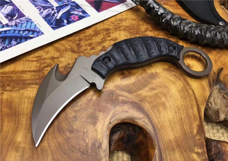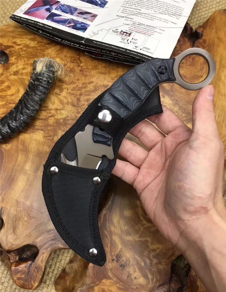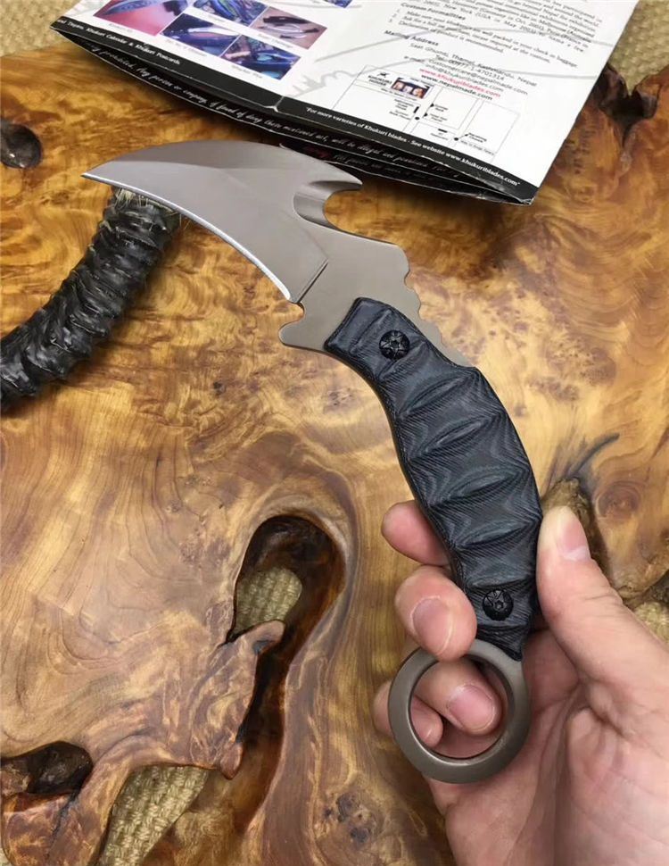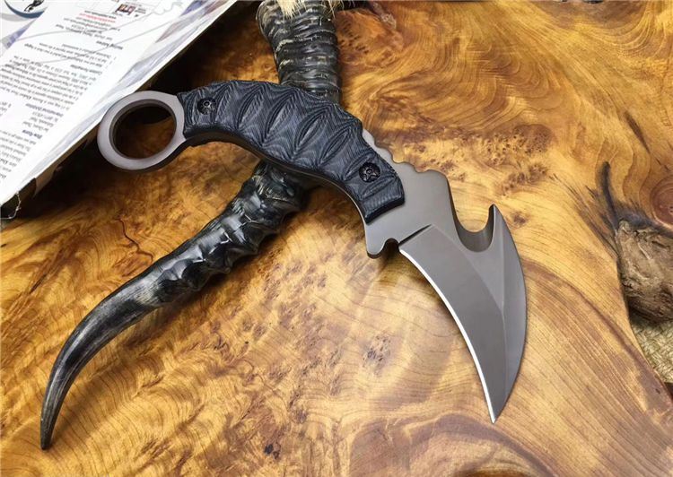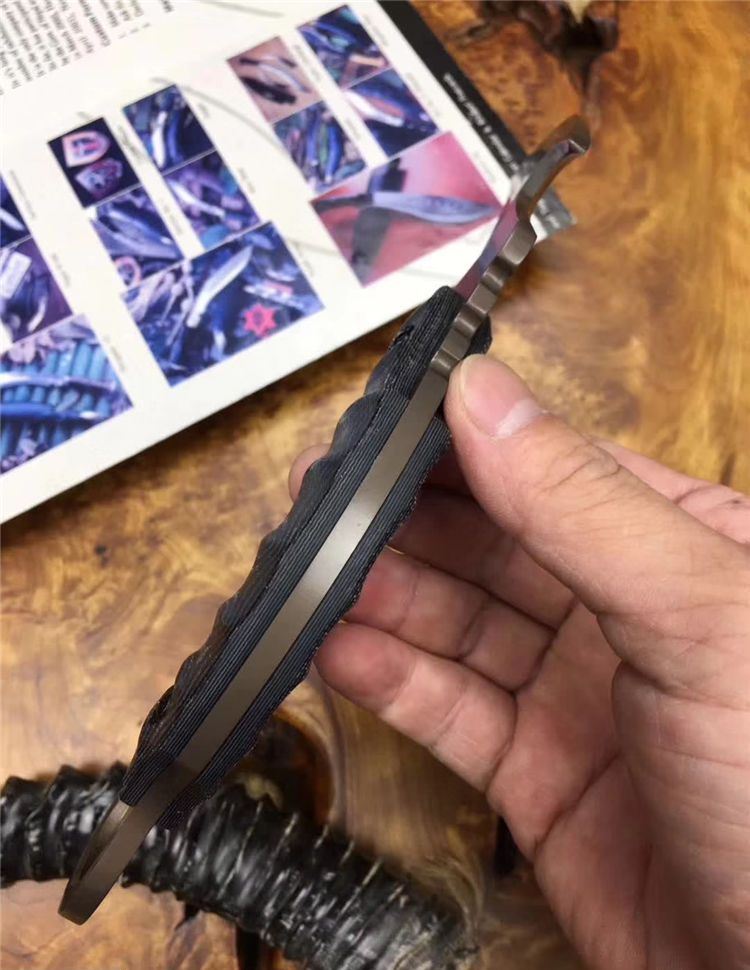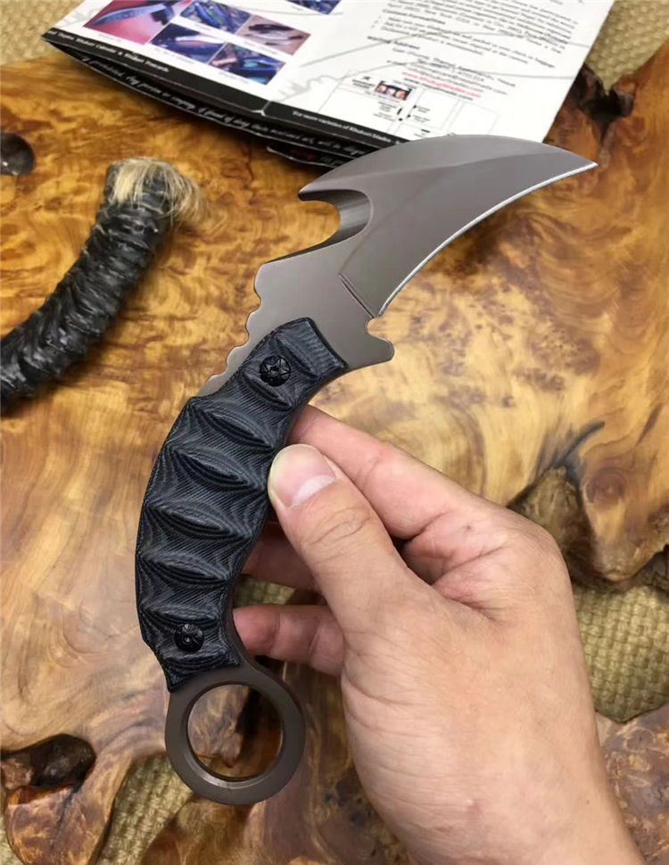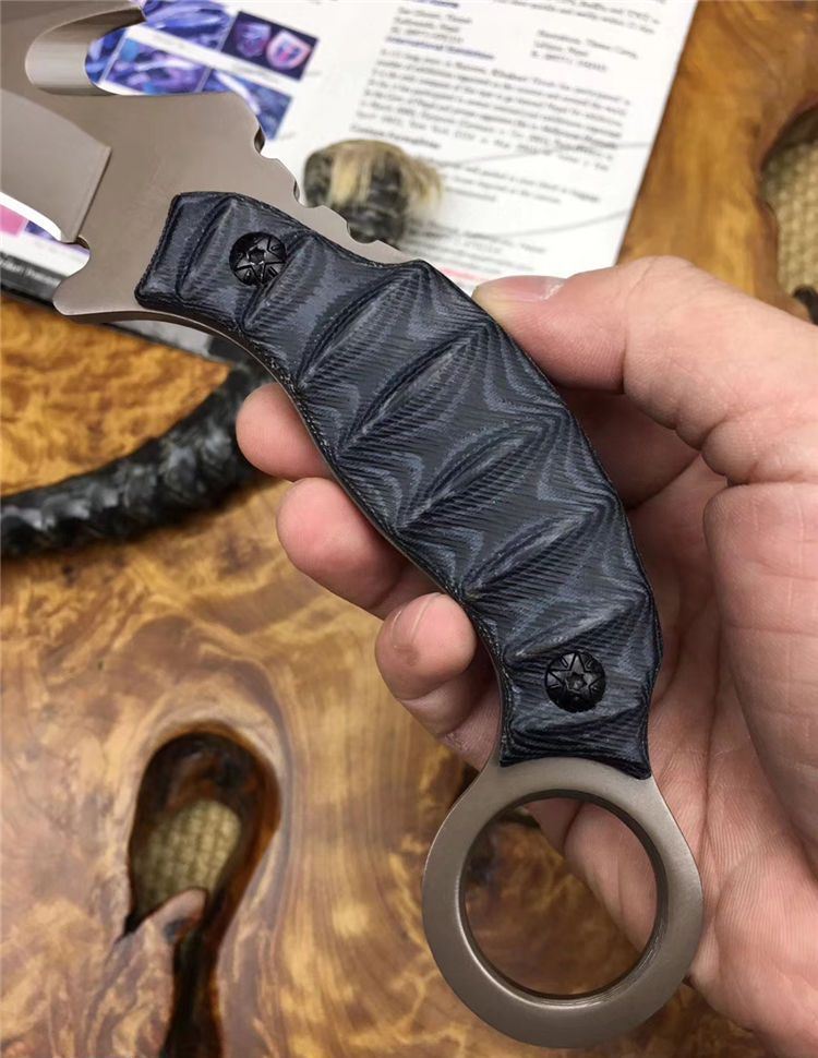 翼龙爪刀 全长: 19.5cm 刃长: 7cm 刃宽: 3.8cm (最宽处) 刃材: 5Cr13 硬度: 57HRC 表面: 镀钛 刃厚: 0.47cm 柄长: 13cm 柄材: 米卡塔 重量:280克