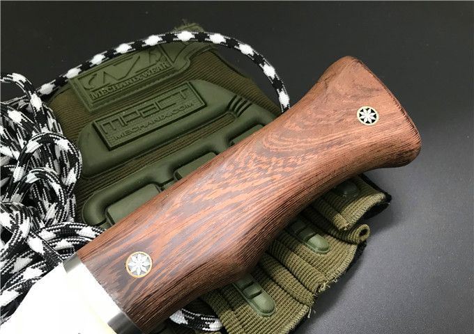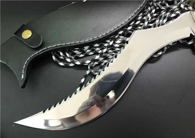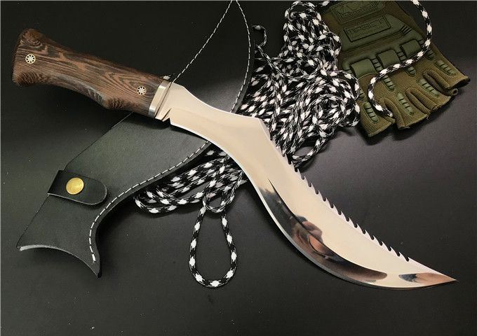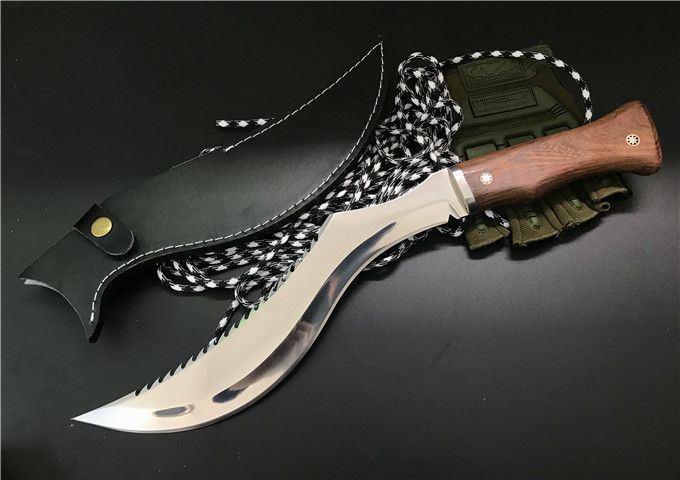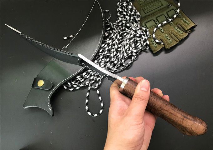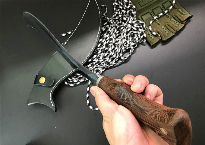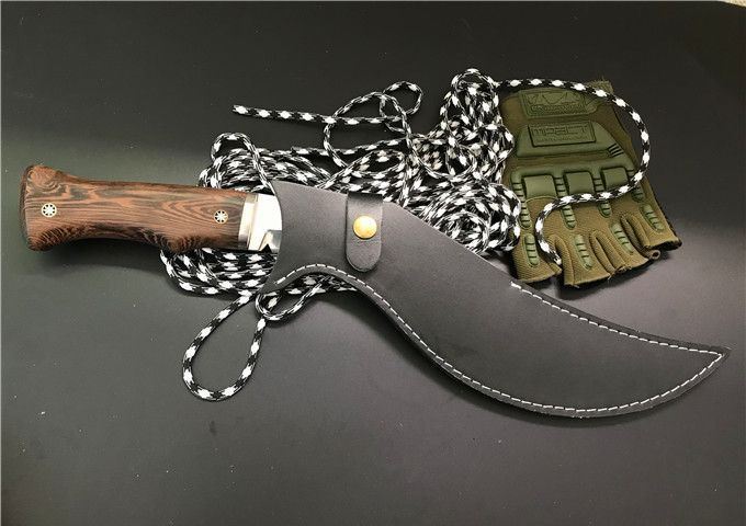 暴风战术狗腿弯刀 全长:44.5CM 刃长:30.5CM 厚度:0.5CM 刃材:7Cr17 硬度:58HRC 重量:约500g 刀面:超镜光面 柄材:鸡翅木 刀鞘:皮套