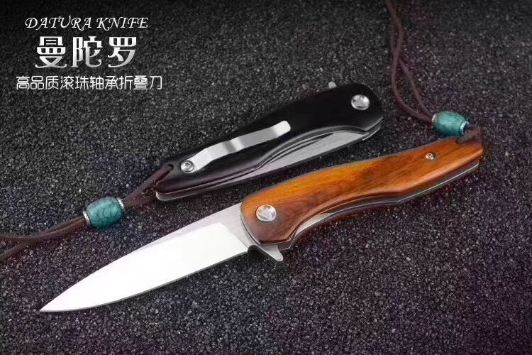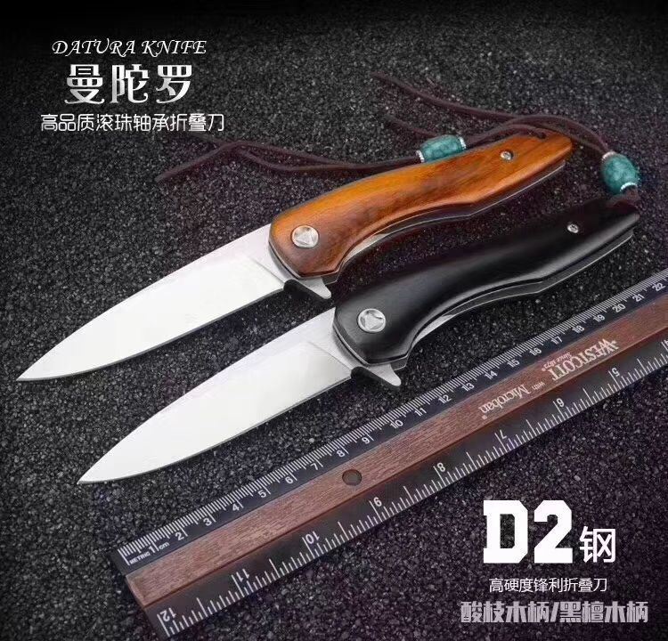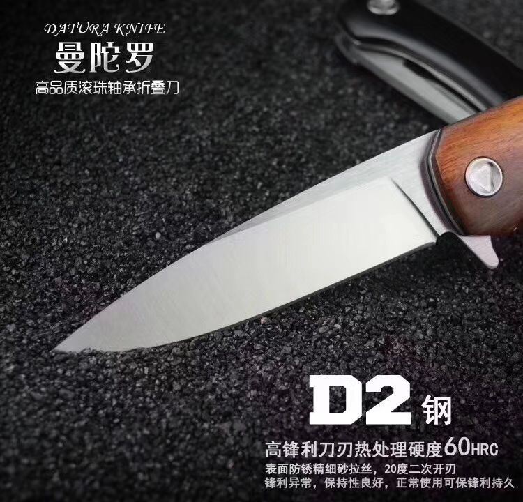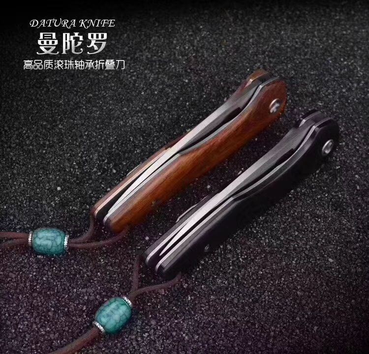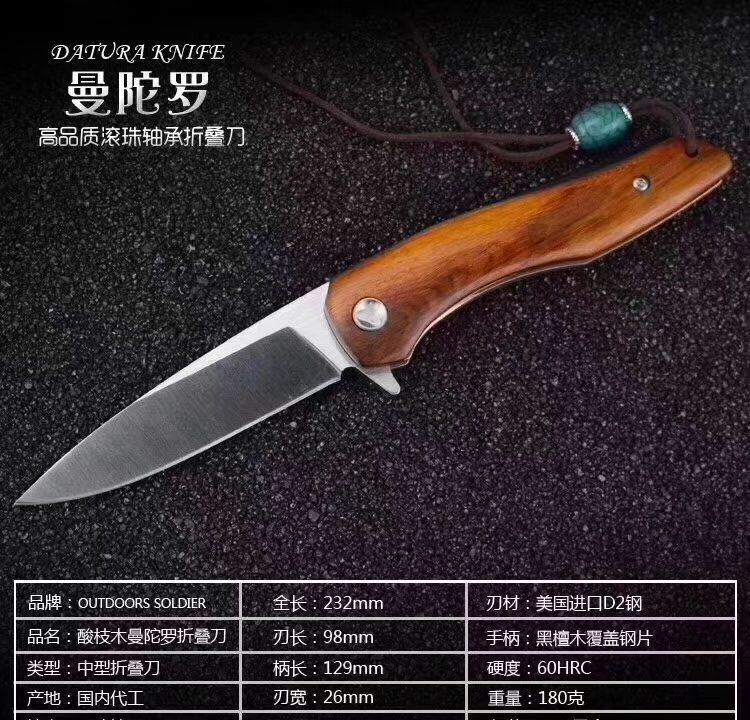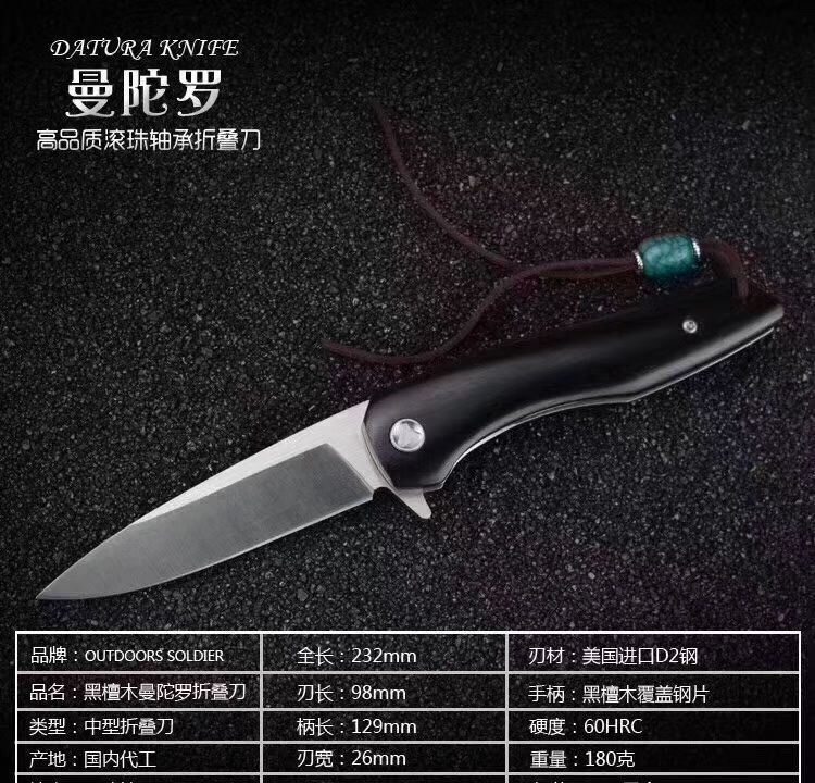 曼陀罗折刀 全长:25cm 刃长:12cm 柄长:9.9cm 硬度:59-60HRC 刃厚:0.3cm 重量:刀重89克 表面:纯手工制造 柄材:红花梨 黑套两种柄 刃材:D2 其他:尼龙套 备注:折刀现在不带后面的珠子 已经送完