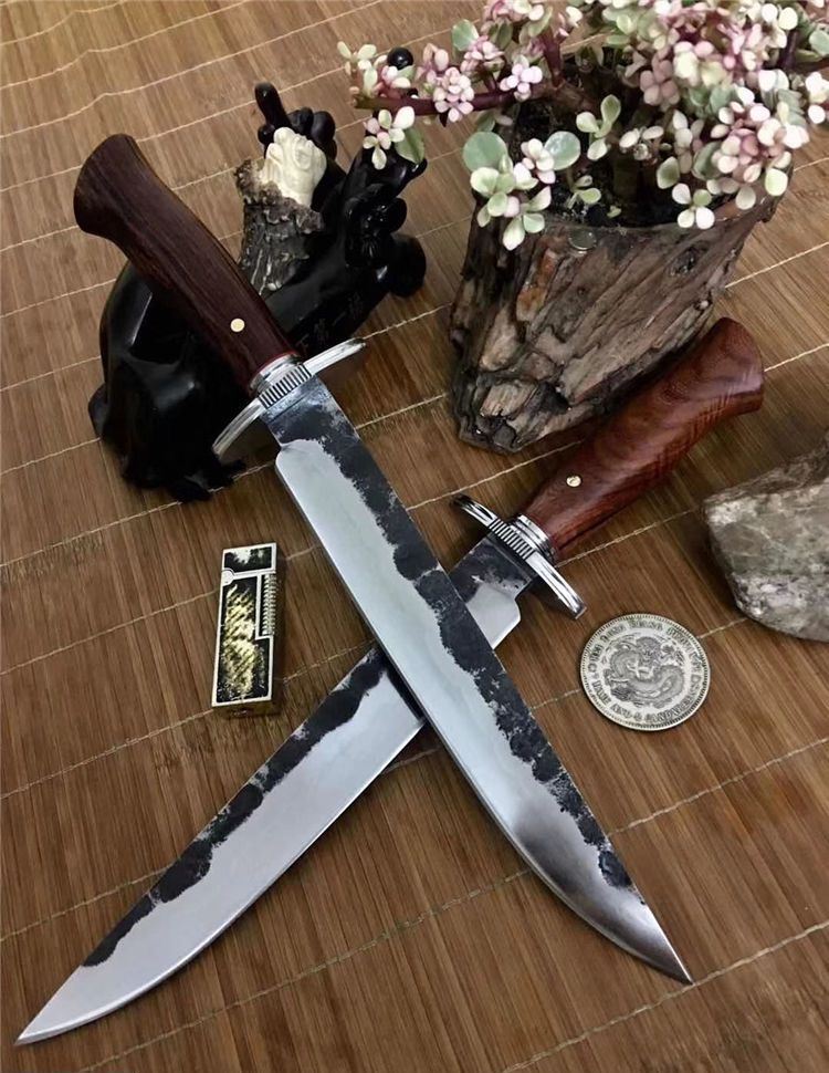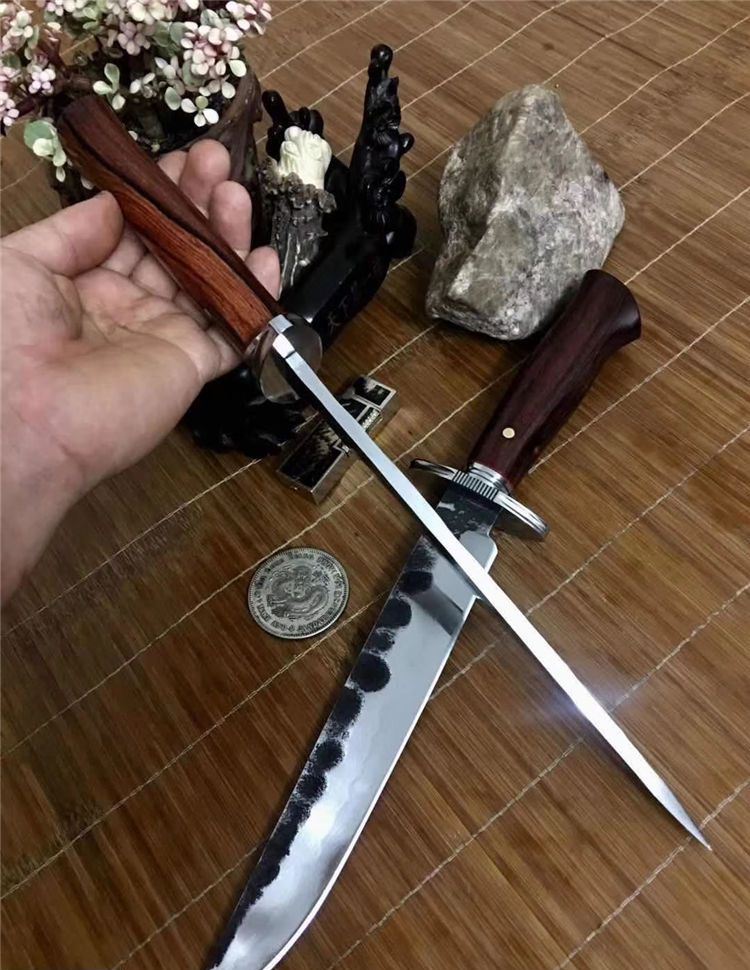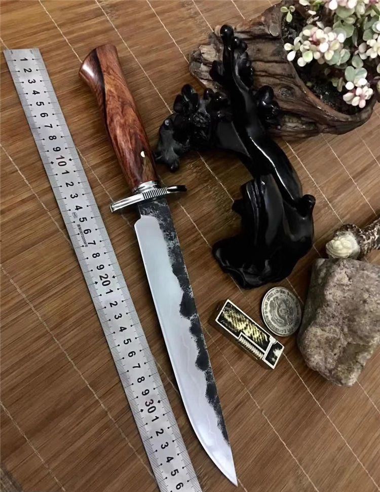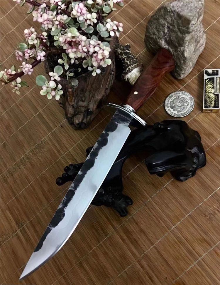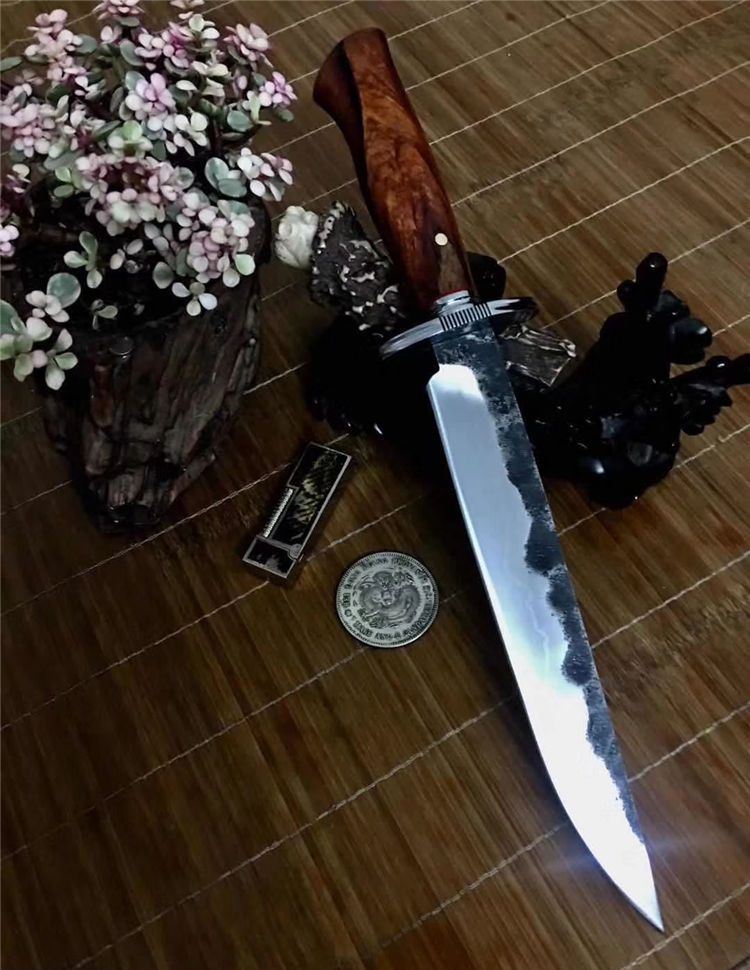 潘大师锻打博弈直刀 总长:38公分 刃长:24公分 厚度:0.5公分 硬度:61 红酸枝木柄 潘先匠人原锻纯手工打造,百分百纯手工制作,多年制刀技术 把控每个细节完工度
