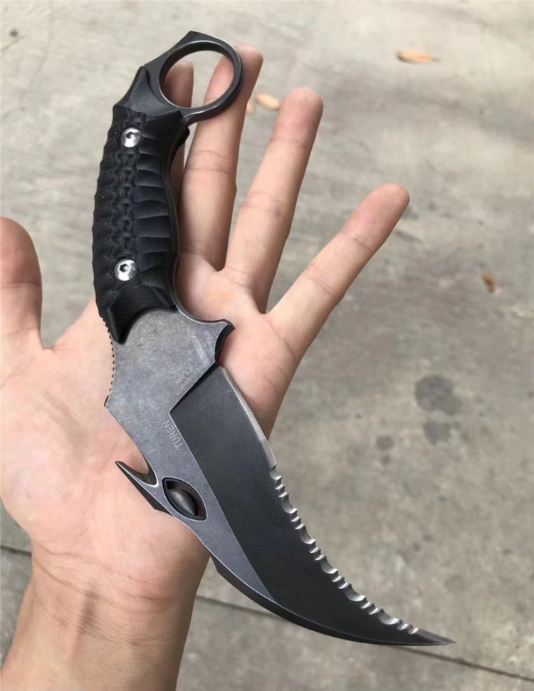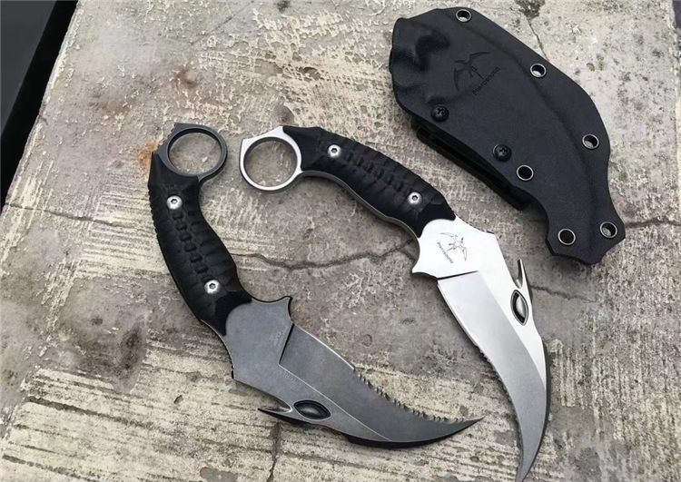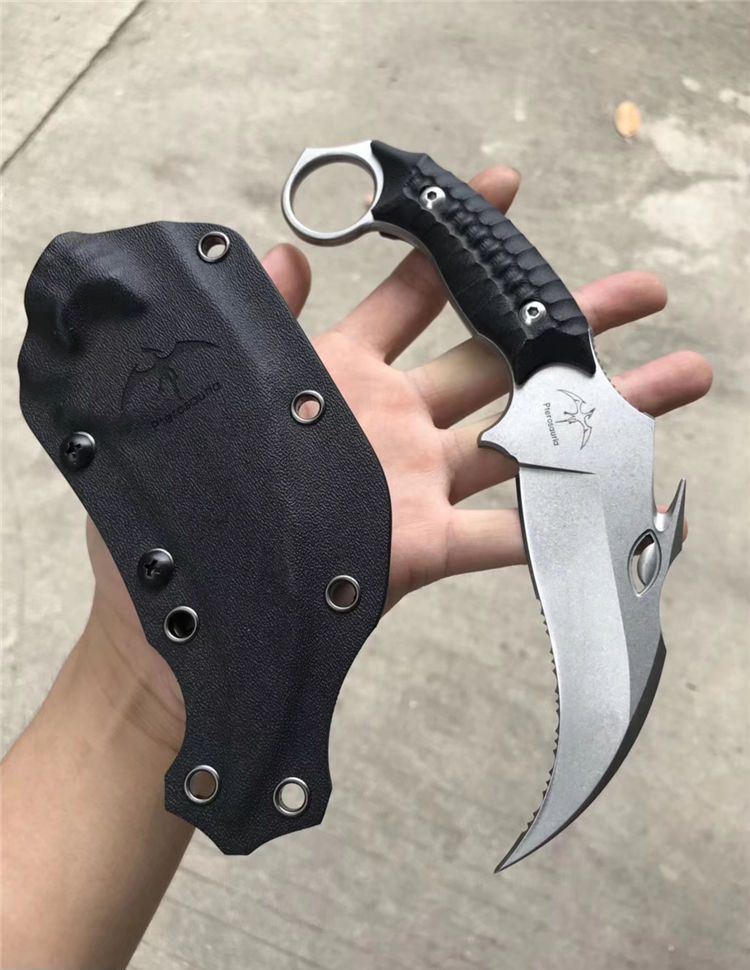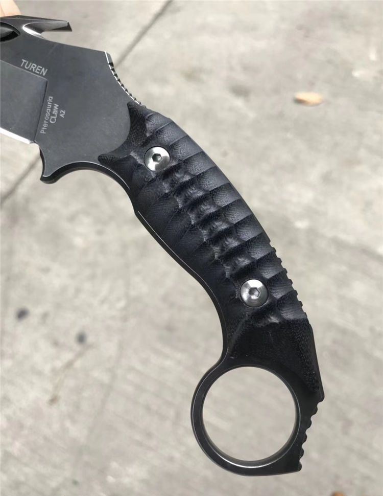TUREN翼龙爪刀 总长:21.5cm 刃长:10cm 刃宽:4.3cm 刃厚:5MM 钢材:进口A2钢 硬度:59-60HRC 热处理:专业真空热处理 结构:一体龙骨结构 柄材:进口G10,电脑CNC龙脊立体感 刀套:进口K鞘,带LOGO 锋利度:一级锋利 包装:黑色手工盒子内垫UVA内衬.送礼高端大气