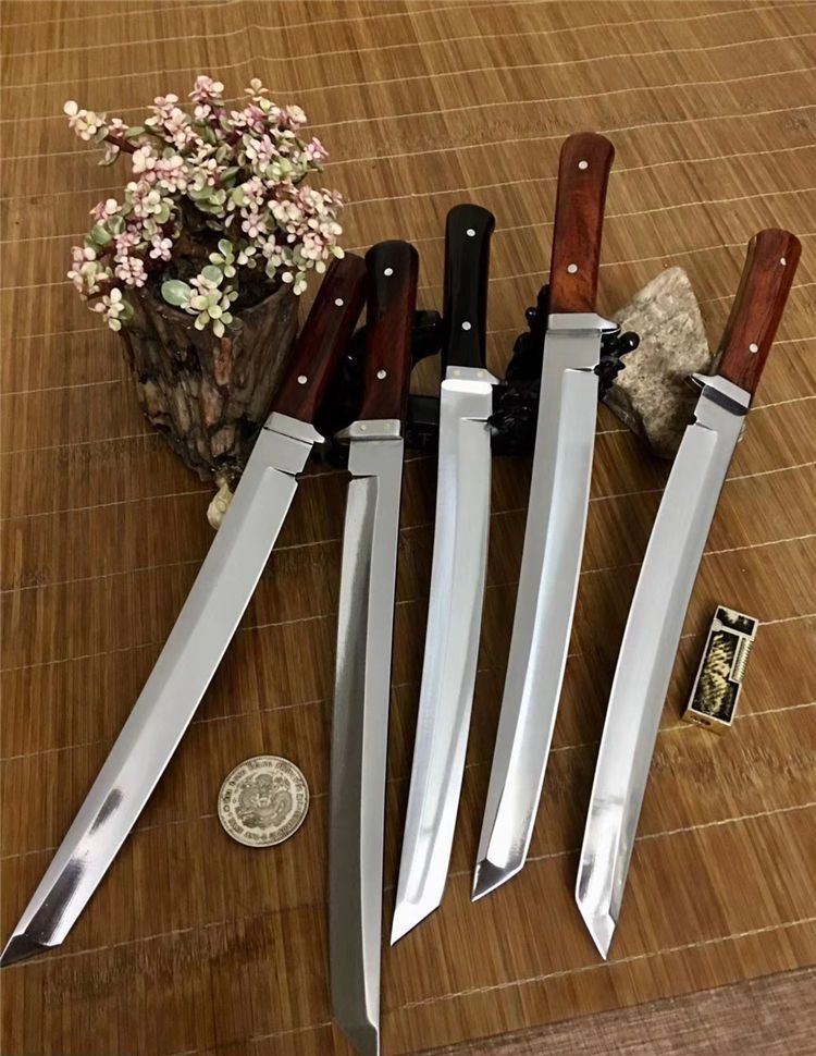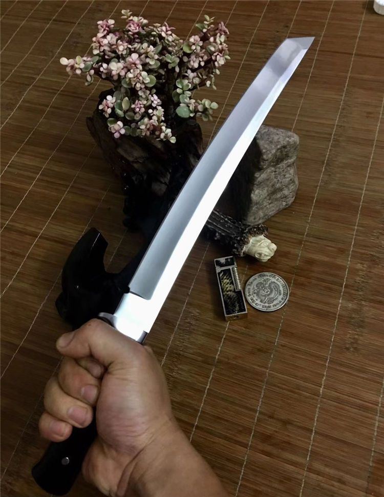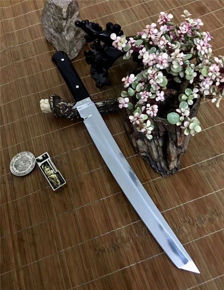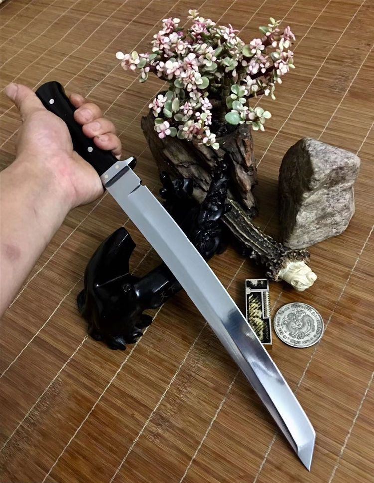 潘大师手工三美武士刀 总长:43cm 刃长:28.5cm 厚度:0.6cm 硬度六十柄进口紫光檀木进口弹簧钢锻造原料 百分百保证全身上下纯手工打造手工技术完工度高