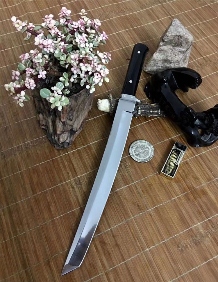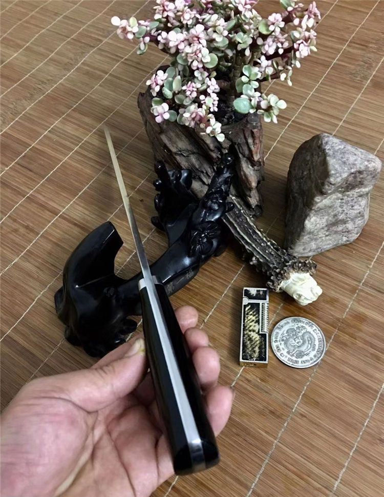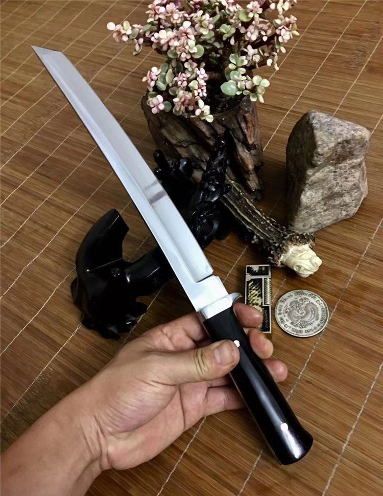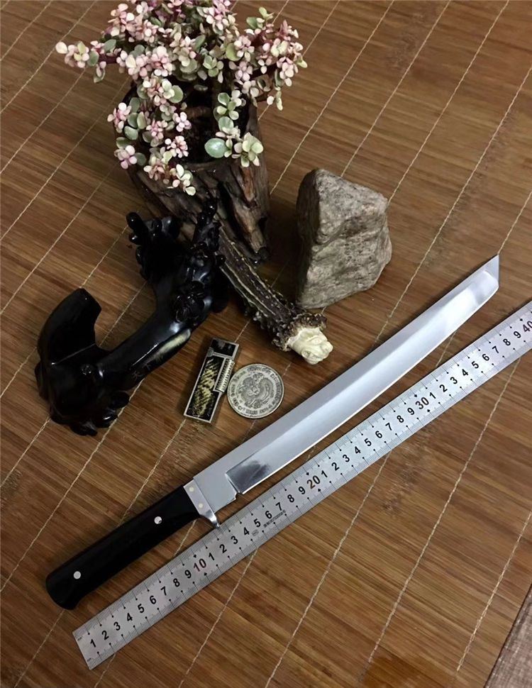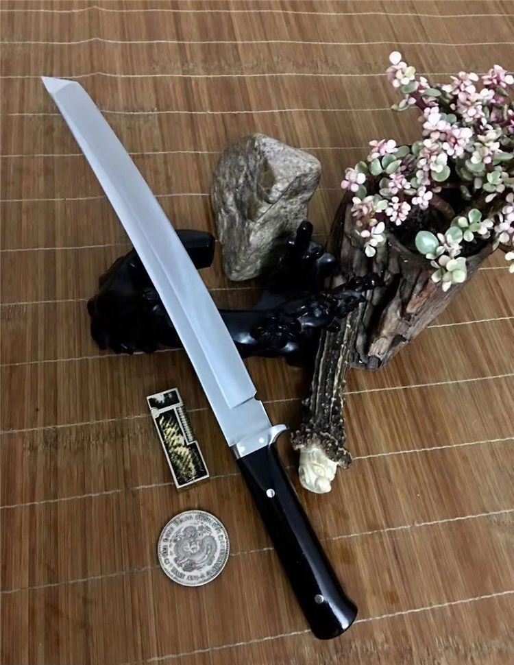 潘大师手工三美武士刀 总长:43cm 刃长:28.5cm 厚度:0.6cm 硬度六十柄进口紫光檀木进口弹簧钢锻造原料 百分百保证全身上下纯手工打造手工技术完工度高