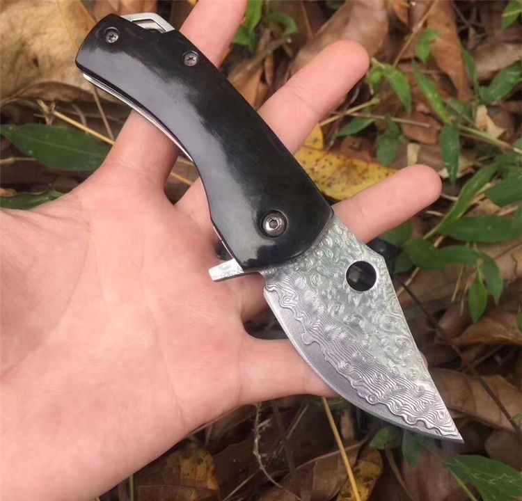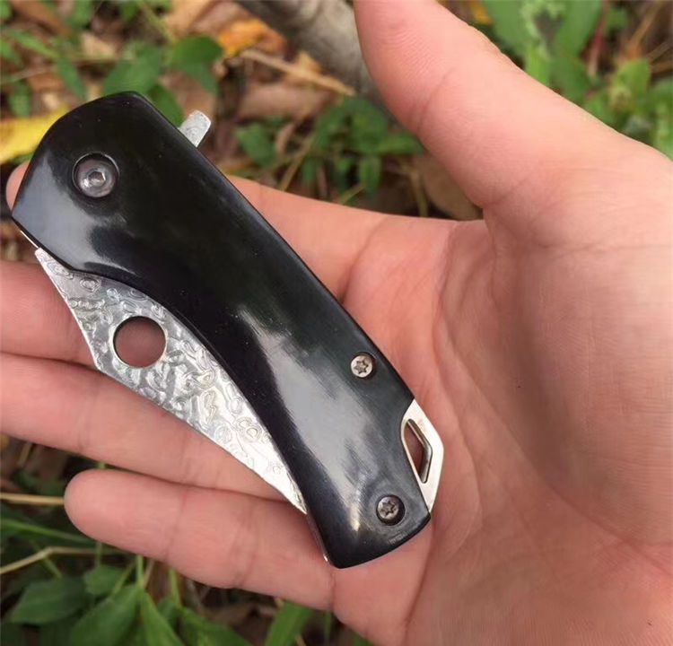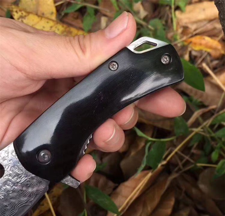 大马士革黑牛折刀 全长:14.5cm 刃长:6cm 柄长:8.3cm 刃宽:3 cm 刃厚:3.0mm 刃材:大马士革钢 重量:104g(含包装) 硬度:58HRC 表面:大马士革原纹 柄材:黑牛角 锁型:侧锁 其他:礼品盒+真皮套