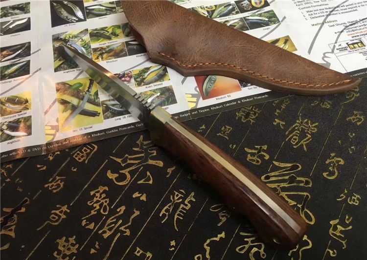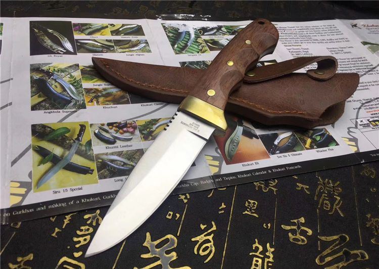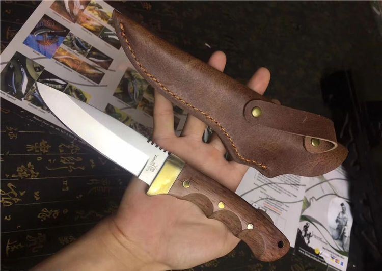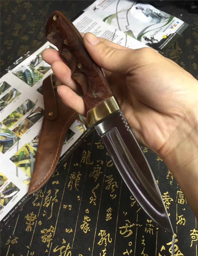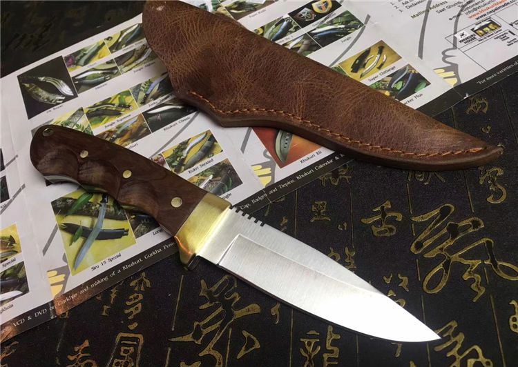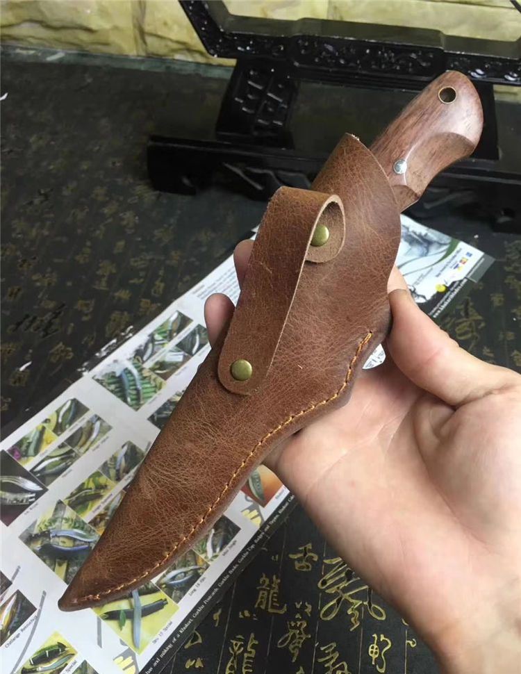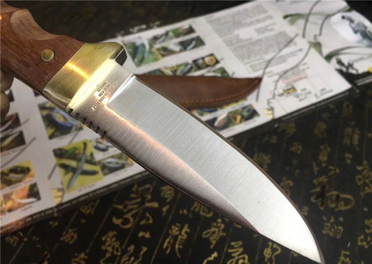 Aisi420猎刀 全长:200mm 刃长:105mm 柄长:100mm 刃宽:31mm 刃厚:5mm 刃材:8CR18Mov 重量:420克(含包装) 硬度:59HRC 表面:砂光 柄材:G酸枝木 锁型:定锁 其他:配头层皮真皮套