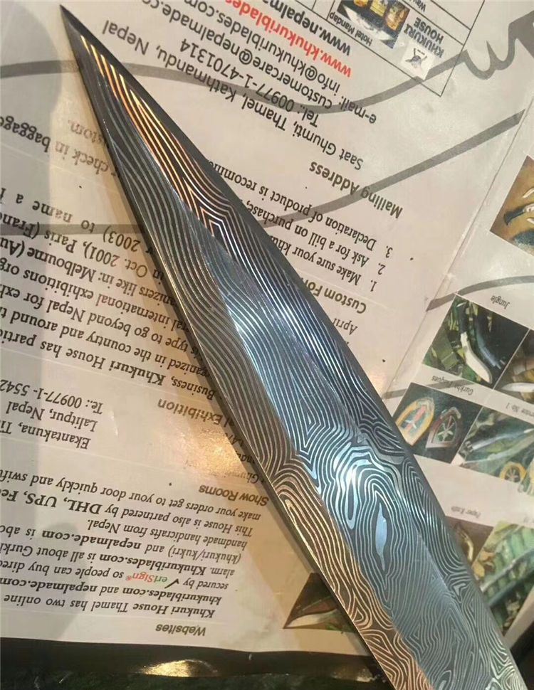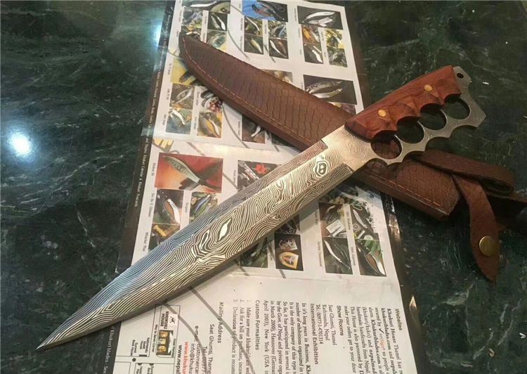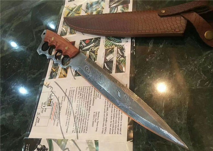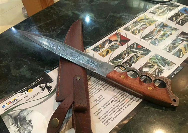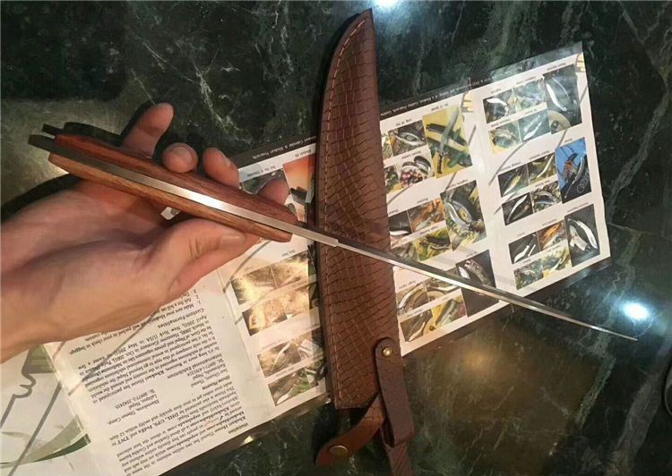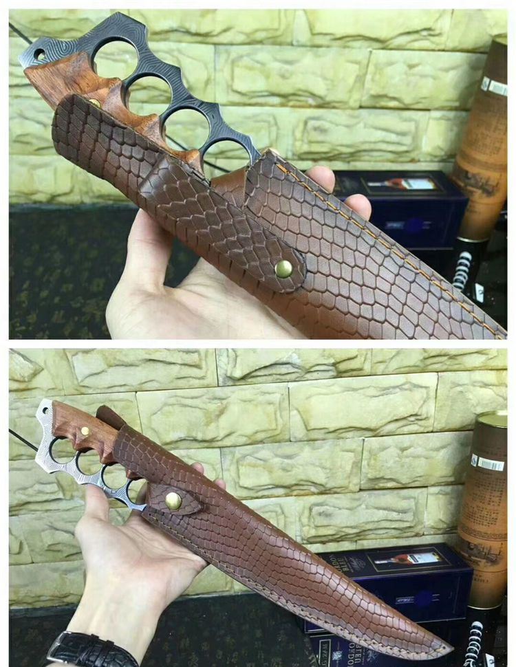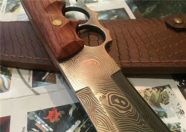 花纹无双手环刀 全长:41.4CM 刃长:27.3CM 柄长:约14CM 刀厚:0.55CM 刃面:花纹 毛重: 约600克(含刀鞘) 钢材: 9cr18mov钢 硬度:59HRC(真空油冷热处理) 柄材:红酸枝木 刀鞘:刻花皮套(锋利)