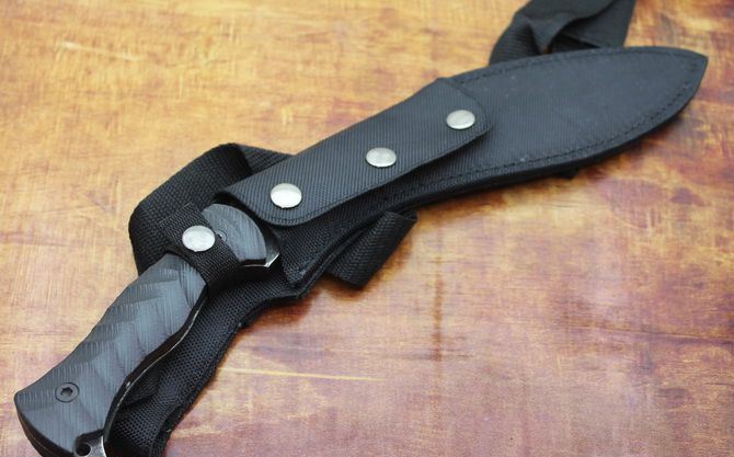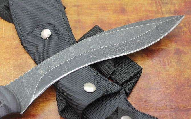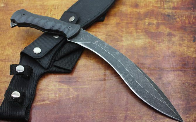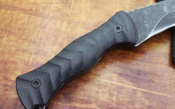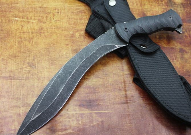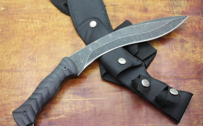 松田菊男瘦身狗腿弯刀(黑版) 全长:38.8CM 刃长:24.5CM 刃材:7Cr17 硬度:59HRC 刃厚:0.58CM 刃宽:4.3CM(最宽处) 柄长:14CM 柄材:G10 刀鞘:尼龙套(可绑腿) 重量:780g